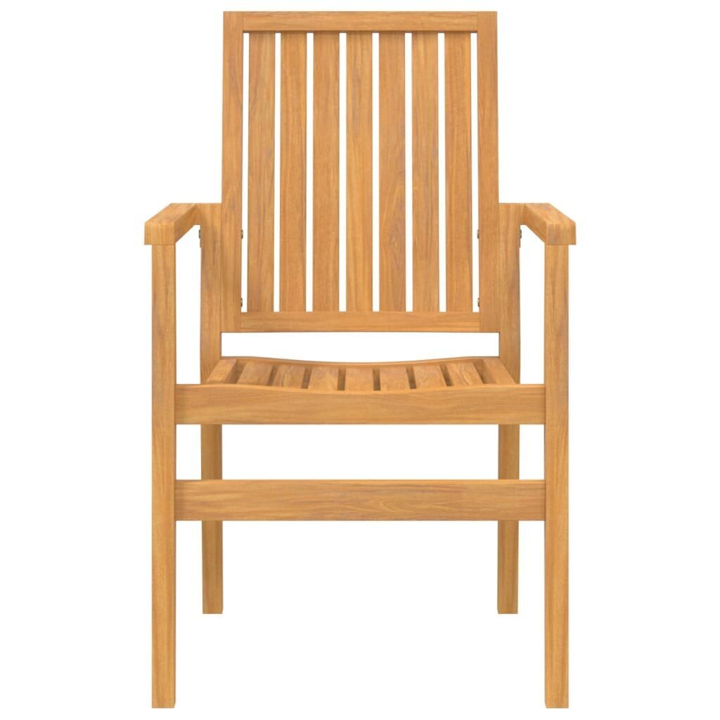 Mėgaukitės maloniu maistu ar popietės arbata savo lauko erdvėje sėdėdami prie šio medinio sodo valgomojo baldų komplekto! Tikmedžio medienos masyvas: tikmedžio medienos masyvas – graži natūrali medžiaga. Jis buvo grūdintas, džiovintas krosnyje ir tuomet šlifuotas smulkiais grūdeliais dengtu švitriniu popieriumi, taip suteikiant jam nepaprastai lygią išvaizdą. Tikmedžio mediena žinoma dėl savo išskirtinio tvirtumo ir atsparumo įvairioms oro sąlygoms.Praktiškas stalviršis: tvirtas valgomojo stalo stalviršis suteiks vietos užkandžiams, vaisių krepšeliams, dekoratyviems ir kitiems reikiamiems daiktams pasidėti.Patogi atsisėsti: atlošas ir porankiai suteikia jūsų sodo kėdei sėdėjimo komforto.Viena ant kitos sukraunamo dizaino: nenaudojant bei siekiant sutaupyti vietos, valgomojo kėdės gali būti sukrautos vienas ant kitos.Lengvai valomas paviršius: lygus paviršius užtikrina, kad sodo baldų komplektas yra lengvai valomas drėgna šluoste. Gera žinoti:Siekiant užtikrinti, kad jūsų lauko baldas išliks gražus, rekomenduojame apsaugoti jį vandeniui atspariu uždangalu.