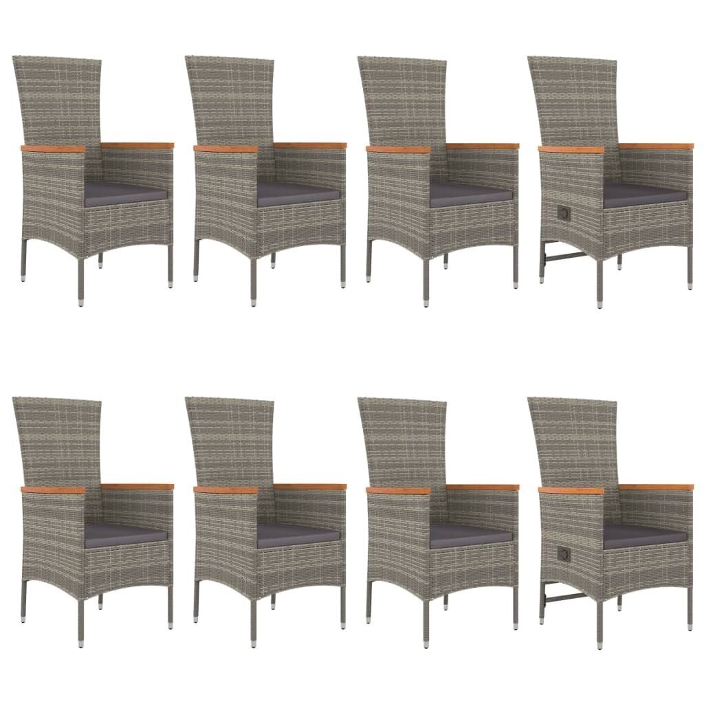 Šis madingas, elegantiško ir šiuolaikiško dizaino sodo valgomojo baldų komplektas bus puikiu pasirinkimu pietavimui ar poilsiui savo sode. Įvairioms oro sąlygoms atspari medžiaga: PE ratanas, taip pat žinomas, kaip poliratanas, yra atsparus įvairioms oro sąlygoms ir lengvai valomas. Jis išlieka gražus netgi laikant jį ilgesnį laiką lauke. Jis pasižymi puikia kokybe, patogumu ir estetiška išvaizda. Tvirtas rėmas: milteliniu būdu dengto plieno rėmai suteikia lauko valgomojo baldų komplektui tvirtumo ir stabilumo kasdieniam naudojimui lauke. Praktiškas stalviršis: tvirtas stalviršis puikiai tiks maistui, gėrimams ir kitiems dekoratyviems daiktams pasidėti. Modulinis dizainas: kiemo valgomojo baldų komplektas yra lengvai pritaikomas ir judinamas iš vienos vietos į kitą, tad galėsite jį derinti su kitomis internetinėje parduotuvėje esančiomis modulinėmis dalimis, taip sukurdami savo asmeninį sodo valgomojo baldų komplektą! Atlošiama funkcija: sodo kėdės pasižymi atlošiama funkcija, tad atlošus galėsite sureguliuoti jums patogia padėtimi. Patogus atsisėsti: storai paminkštintos pagalvėlės sėdėjimo metu suteiks komforto. Gera žinoti: Siekiant užtikrinti kaip įmanoma lengvesnį montavimą, kiekvienas gaminys pristatomas su vartotojo vadovu. Pastaba: Siekiant užtikrinti, kad jūsų lauko baldas išliks gražus, rekomenduojame apsaugoti jį vandeniui atspariu uždangalu.