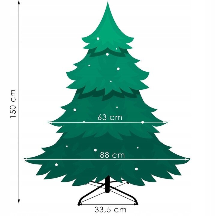 - Techninės eglutės charakteristikos: Eglutės aukštis siekia 150 cm, o maksimalus tarpatramis apie 88 cm, su 10 lygių ir 44 šakomis, pagaminta iš eco plėvelės ir PE šakelių, tamsiai žalios spalvos.