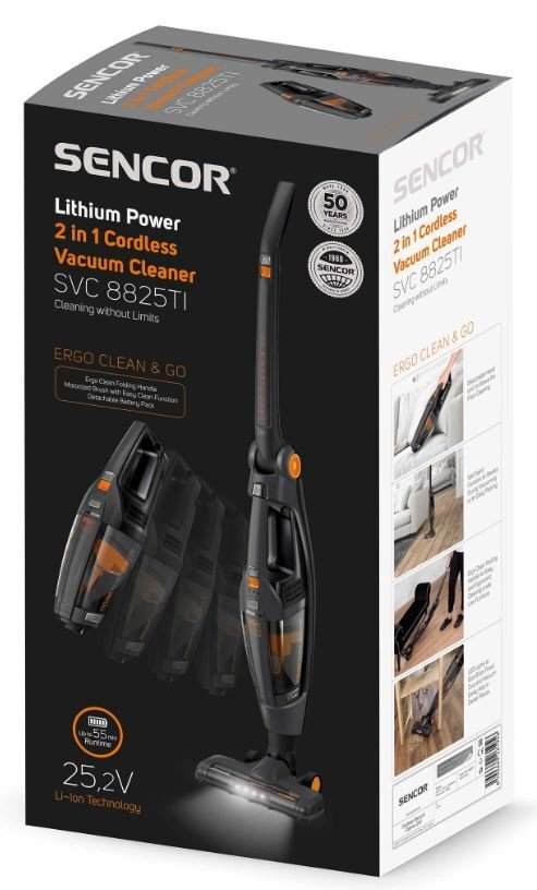 Sencor SVC8825TI turi nuimamą rankinį įrenginį, galingumą 25,2 V, įkrovimo laiką 4-6 valandos, veikimo laiką iki 55 minučių, 180° pasukamą antgalį su LED apšvietimu, ergonomišką rankeną, baterijos energijos indikatorių, du greičio režimus ir priedus, įskaitant siaurą antgalį ir dulkių šepetėlį.