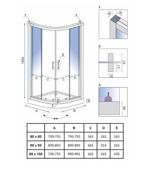 Šio dušo kabinos modelio dydis yra 90×90 cm.