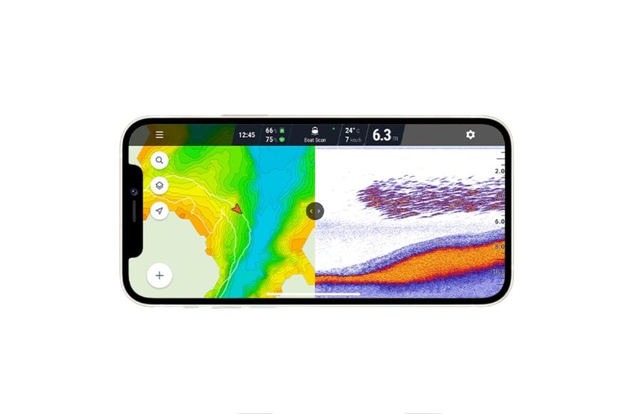 Pamatykite žuvis, povandeninę augmeniją, dugno struktūrą ir kietumą. Deeper programa taip pat rodo vandens temperatūrą, apima įvairias spalvų paletes, papildomas piktogramas ir pranešimus, jautrumo koregavimus ir tradicinę poledinei žūklei skirtą blykstę.