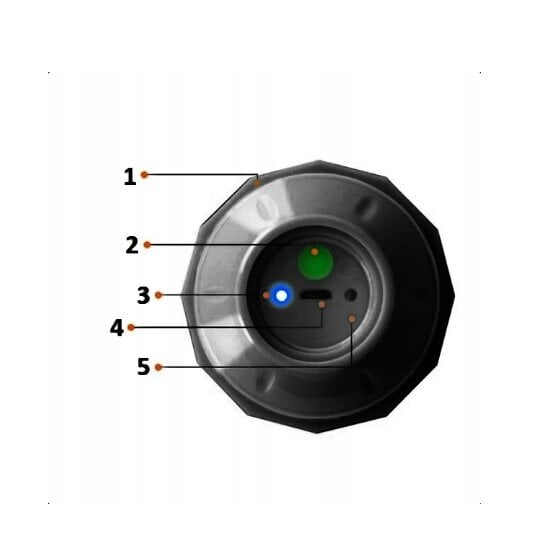 - Įkrovimo indikatorius: raudonas diodas išjungtas