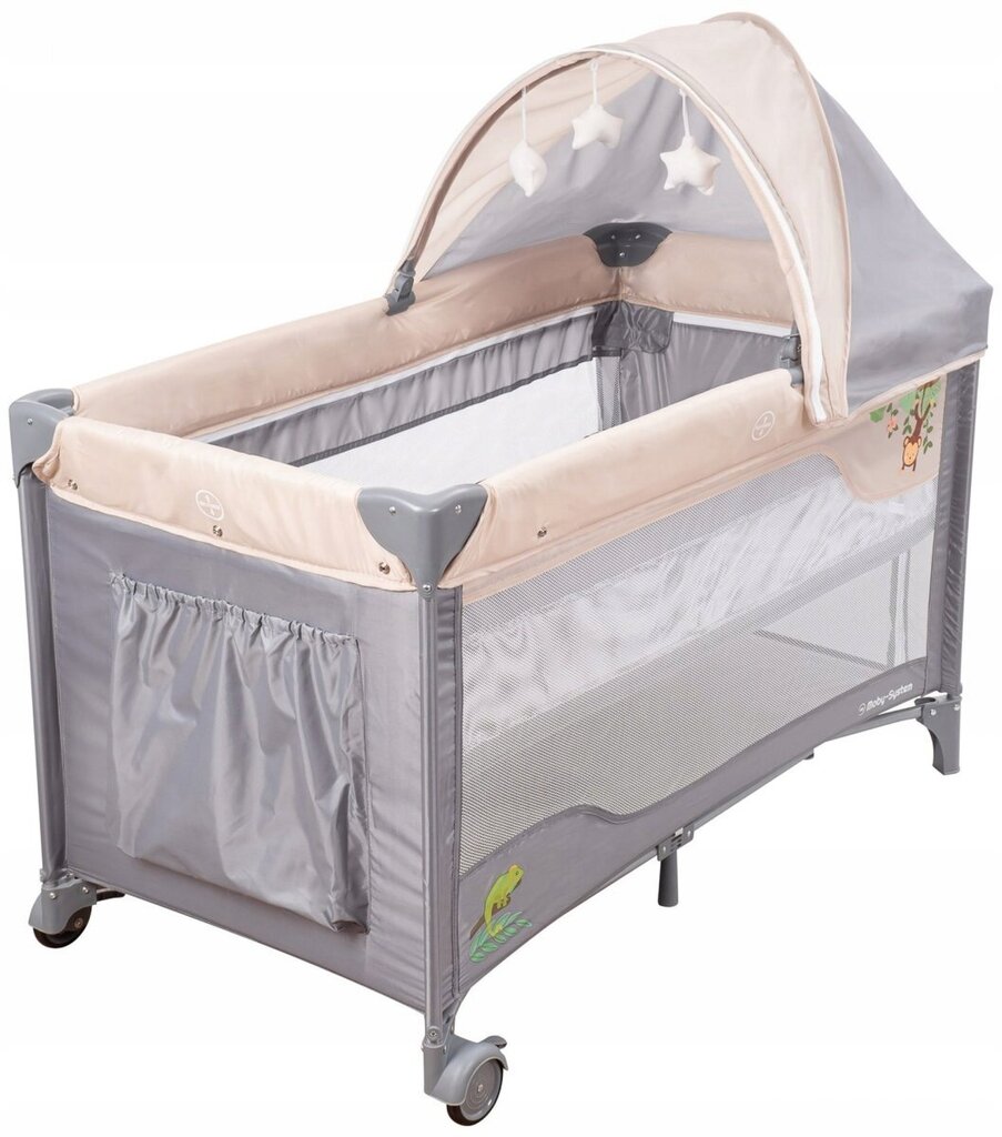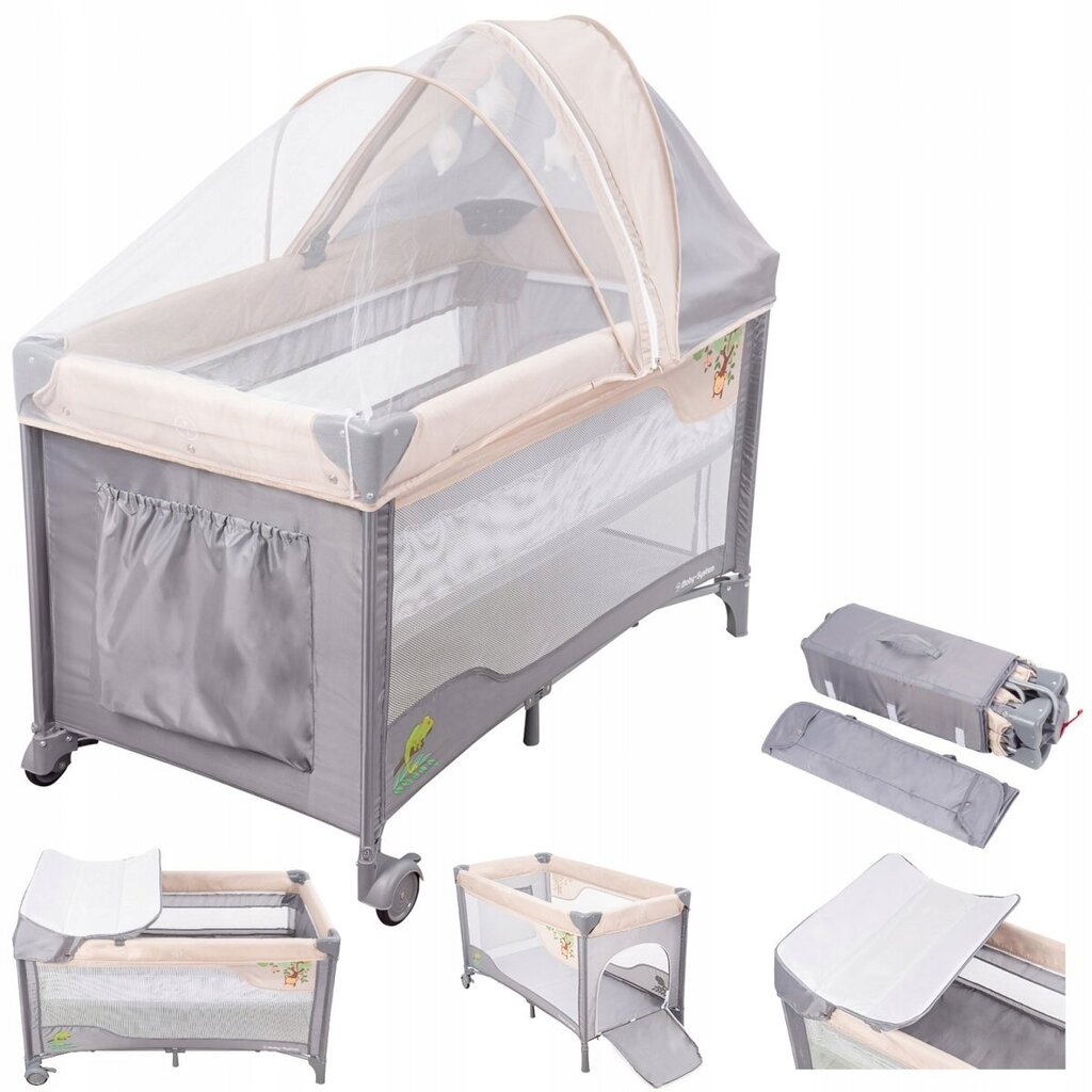 Komplektą sudaro čiužinys, vystymo stalas, baldakimas ir tinklelis nuo uodų.
