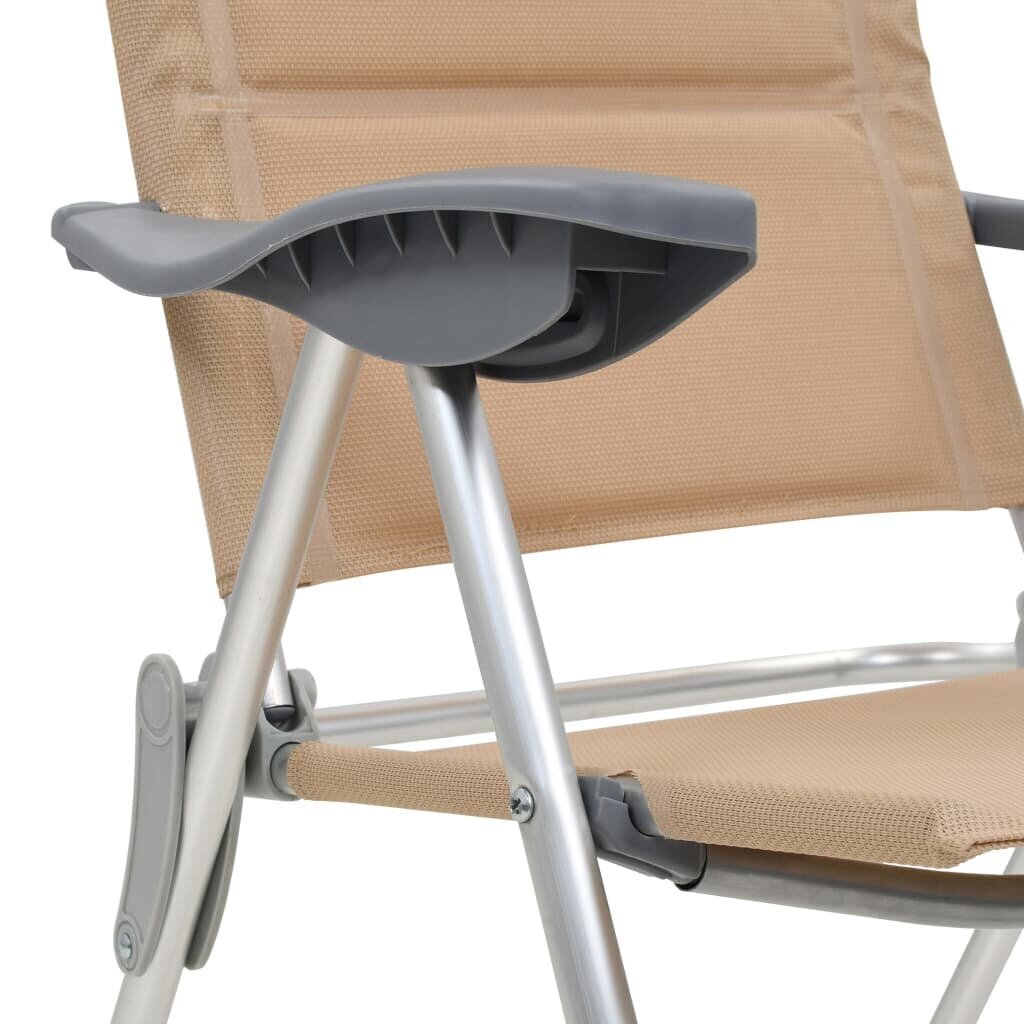 Šis 2 dalių aliuminių kempingo kėdžių komplektas puikiai tinka medžiojant, stovyklaujant, žvejojant, keliaujant ar kitaip leidžiant laiką lauke. Kėdės gali būti reguliuojamos 5 padėtimis bei turi paminkštintą atramą galvai. Tvirtos konstrukcijos dėka, šios lauko kėdės yra patvarios bei stabilios. Aukštos kokybės tekstileno sėdynė ir atrama nugarai nenusidėvi. Lengvo aliuminio rėmo bei sulankstomo dizaino dėka, kėdes lengva pasiimti kartu ir judinti iš vieno taško į kitą. Be to, kai nėra naudojamos ar transportuojant bei padedant laikymui, šios prabangios sodo kėdės gali būti lengvai sulankstomos. Pristatymą sudaro 2 kempingo kėdės.