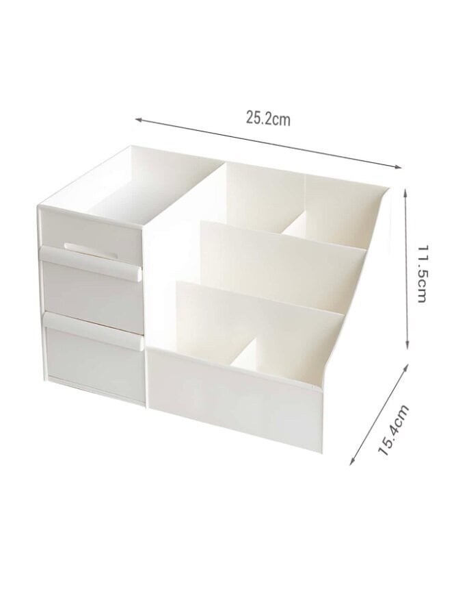 Kosmetikos priemonių dėžutės su stalčiais matmenys yra 25x11x15 cm.