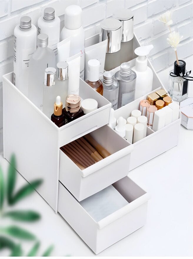 - Kosmetikos priemonių dėžutė su stalčiais: Ši dėžutė yra skirta įvairioms kosmetikos priemonėms tvarkingai laikyti, turinti kelis stalčius ir kompaktišką dydį.