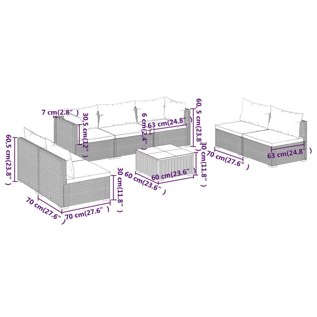 Pasimėgaukite savo laisvalaikiu sėdėdami prie šio madingo sodo poilsio baldų komplekto! Jis patenkins įvairius jūsų poreikius. Tvirtas rėmas: šis kiemo poilsio baldų komplektas pasižymi tvirtu milteliniu būdu dengto plieno rėmu ir plastikinėmis, chromu dengtomis kojelėmis, tad jis yra itin patvarus.Aukštos kokybės medžiaga: sodo sofos komplektas yra pagamintas iš vandeniui atsparaus PE ratano, kuris užtikrina, kad jis yra lengvai valomas, ilgaamžis ir tinkamas kasdieniam naudojimui lauke.Modulinis dizainas: modulinis dizainas taip pat leidžia pastatyti komplektą skirtingomis konfigūracijomis arba, siekiant patenkinti jūsų poreikius, derinti jį su kitomis modulinėmis dalimis.Papildomas sėdėjimo komfortas: storai paminkštintos ir nuimamos pagalvėlės bei pagalvės sėdėjimo lauke metu suteiks jums optimalaus komforto. Pastaba:Norėdami, jog jūsų lauko baldai tarnautų ilgą laiką, rekomenduojame juos reguliariai valyti ir nepalikti lauke be reikiamos apsaugos.Valymas: naudokite švelnaus muilo tirpalą.Laikymas: jei įmanoma, laikykite vėsioje, sausoje patalpoje. Jei prekė laikoma lauke, apsaugokite ją vandeniui nepralaidžia danga. Po lietaus ar sningant, nuvalykite vandens ir sniego perteklių nuo plokščių paviršių. Palikite pakankamai oro cirkuliacijos, taip išvengsite su drėgme susijusios žalos.
