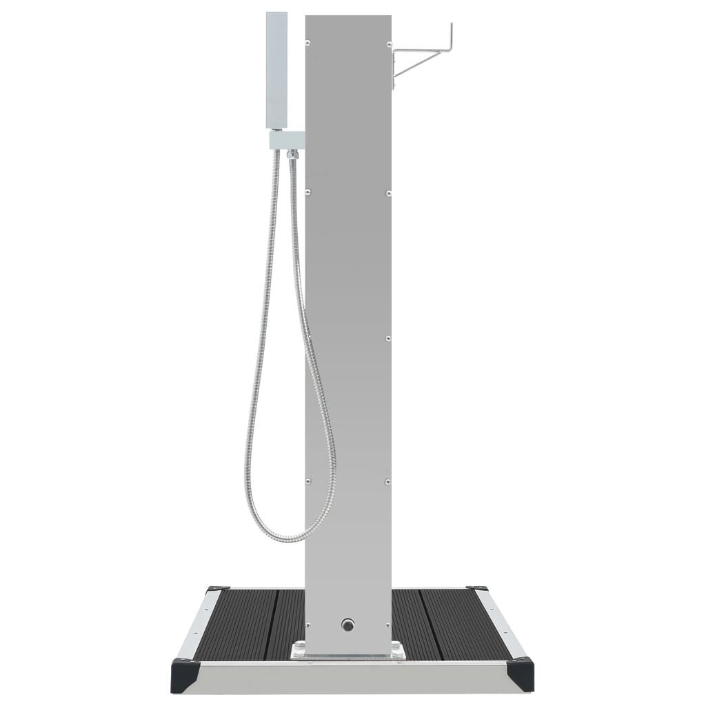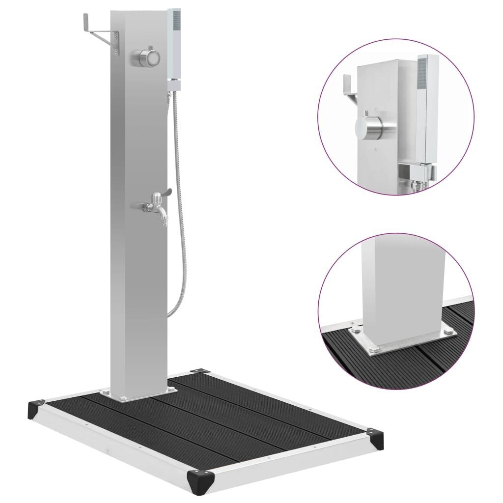 Mūsų sodo dušo maišytuvas pasižymi stilingu dizainu. Kartu su elegantišku dušo padėklu, jis taps puikia jūsų baseino zonos ir kitos lauko erdvės detale. Sodo maišytuvas yra pagamintas iš patvaraus šlifuoto nerūdijančio plieno, kuris užtikrina jo atsparumą įvairioms oro sąlygoms. Jis turi maišytuvą ir rankinę dušo galvutę, kurie gali patenkinti jūsų sodininkystės, laistymo ir greito nusiprausimo poreikius. Jis taip pat turi lengvam vandens žarnos pakabinimui skirtą laikiklį. Mūsų dušo pagrindas užtikrina aukščiausio lygio higienos apsaugą, pasižyminčia patvarumu ir atsparumu korozijai. Sodo dušo padėklas yra lengvai valomas tiesiog drėgna šluoste. Be to, siekiant užtikrinti lengvą įrengimą, iš anksto išgręžtos tvirtinimui skirtos angos. Dušo sistemą ir padėklą lengva surinkti. Į pristatymą taip pat įeina montavimui skirti priedai.