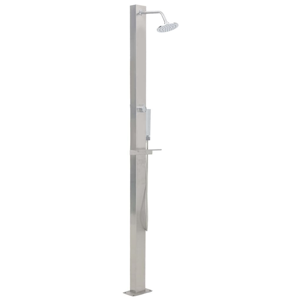 Mūsų universali dušo sistema yra stilingo dizaino ir taps puikia jūsų sodo ar kiemo zonų detale. Dušo sistema yra pagaminta iš patvaraus, šlifuoto nerūdijančio plieno bei pasižymi gražiu, lenktu dizainu. Jis pasižymi dvejomis funkcijomis: lietaus srovės dušu ir rankine dušo galvute, kurios gali būti lengvai pasirinktos rankenėlės pagalba. Panirkite į neabejotinai atpalaiduojantį maudymosi duše potyrį ir mėgaukitės moderniu šio gražaus dušo sistemos stiliumi! Dušo sistemą lengva surinkti. Į pristatymą įeina montavimui skirti priedai. Pastaba: produktas neveikia saulės energija ir nėra karšto dušo plokščių sistema.