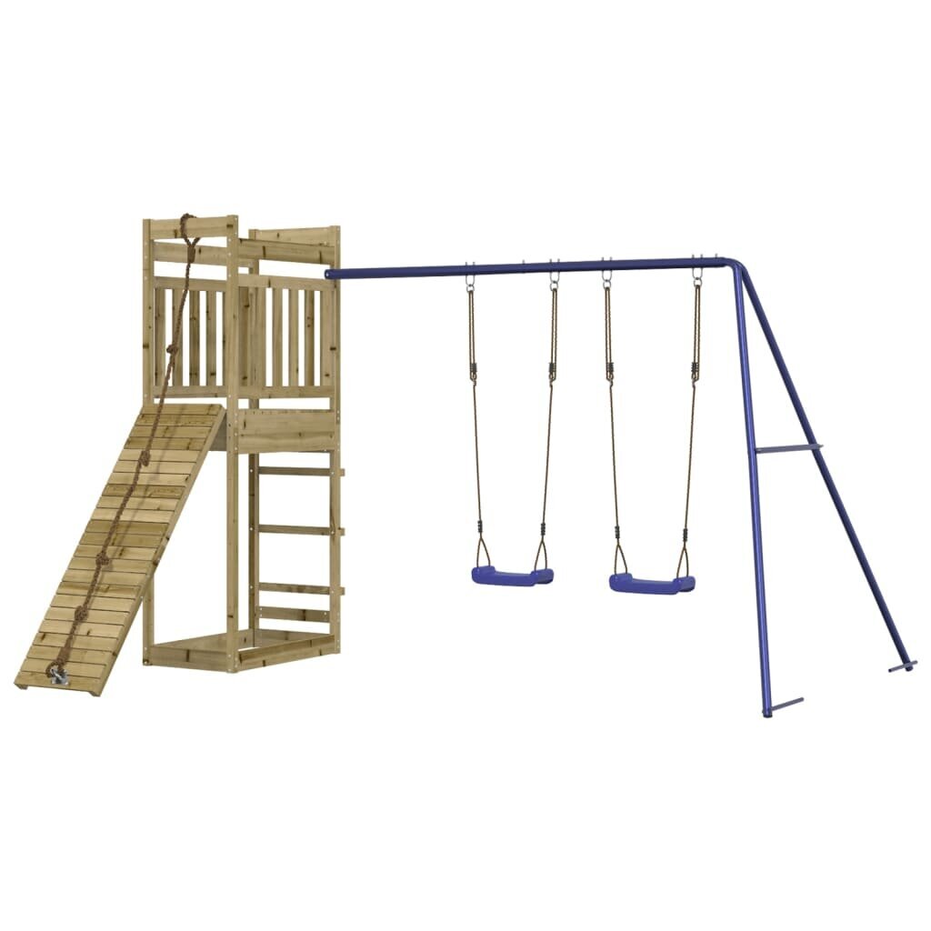 - Medinė lauko žaidimų aikštelė su daugybe veiklų: Šis komplektas yra pagamintas iš impregnuotos pušies medienos, pasižymi tvirti ir stabilūs rėmais, ir suteikia vaikams daugybę pramogų su laipiojimo sienele, sūpynėmis ir smėlio dėže.