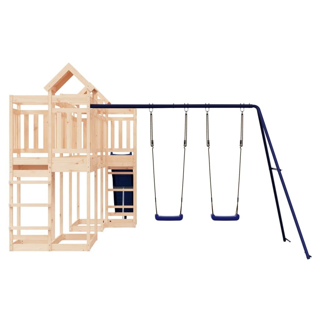 Medinis lauko žaidimų aikštelės komplektas pagamintas iš pušies medienos masyvo, turi tvirtą ir stabilų rėmą, platformą, banguotą čiuožyklą, dviejų sūpynių komplektą ir smėlio dėžes, suprojektuotas užtikrinti vaikų saugumą ir suteikti daug pramogų.