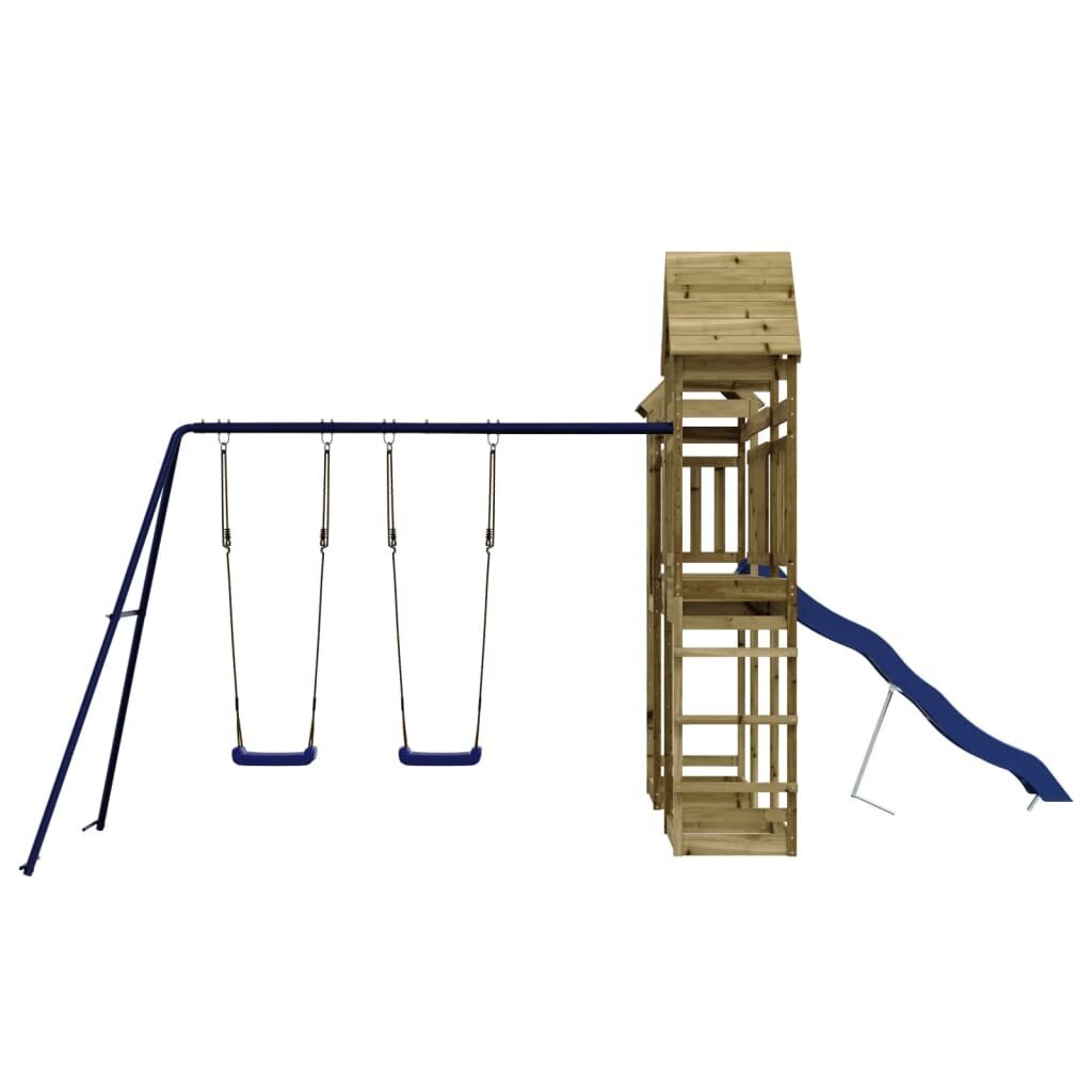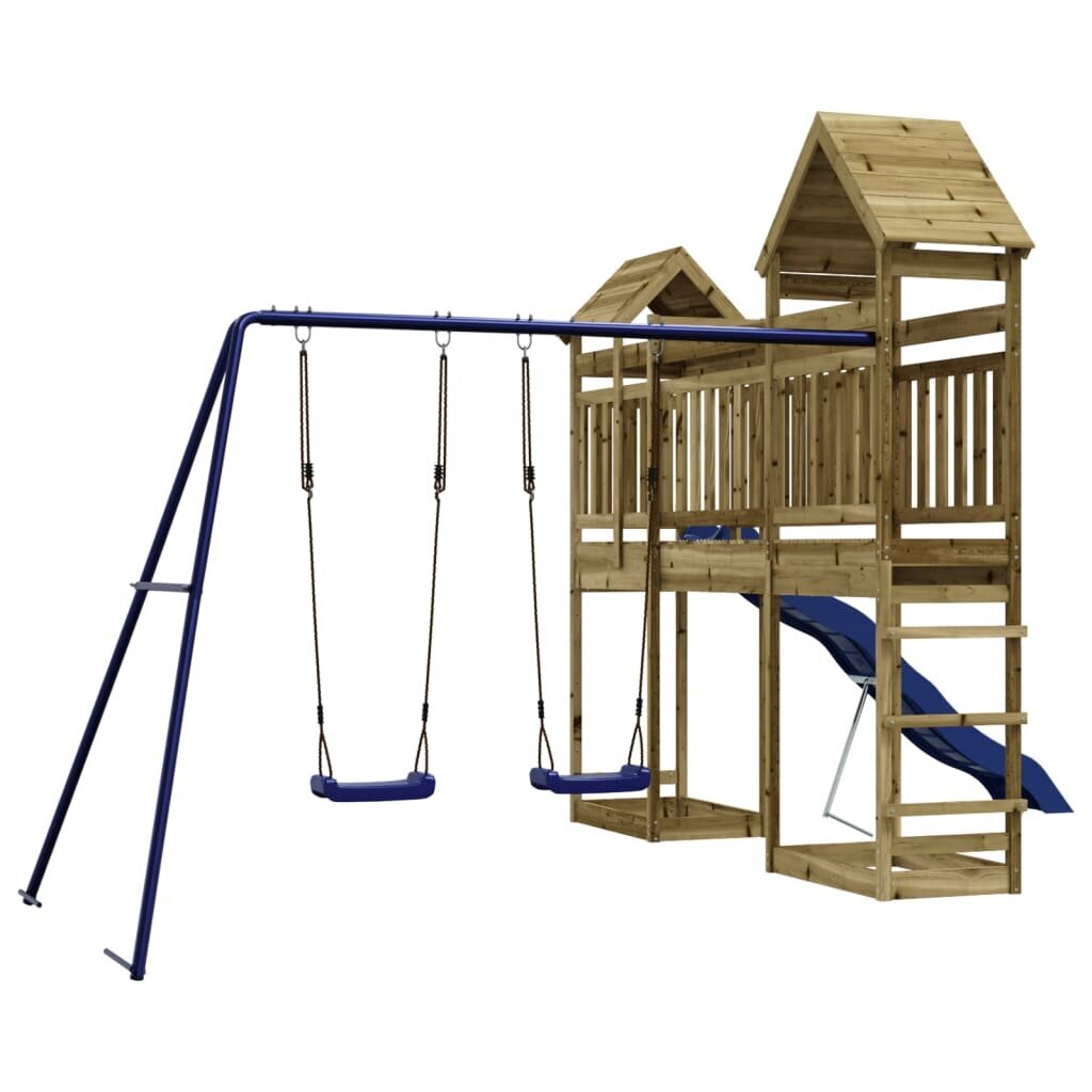 Medinis žaidimų aikštelės komplektas yra pagamintas iš vakuuminiu slėgiu impregnuotos pušies medienos, kuri pasižymi tvirtumu ir atsparumu oro sąlygoms.