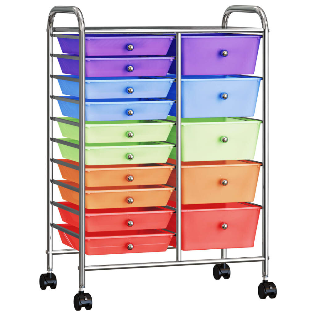 Šis vežimėlis su stalčiais pasižymi glaustu bei praktišku stiliumi, tad jis suteikia pakankamai vietos tvarkingai bei lengvai pasiekiamus laikyti savo biuro ir grožio reikmenis. Chromuotas rėmas užtikrina tvirtą ir patvarią svorio atramą, o 15 išimamų krepšių suteikia pakankamai vietos jūsų daiktams. Juos lengva išimti ir valyti. Taip pat, su įmontuotais 4 pasukamais ratukais galėsite jį lengvai transportuoti ir laikyti. Šis vežimėlis daiktams gali būti greitai surinktas.