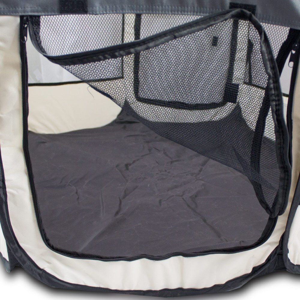 Šiame aukštos kokybės aptvare yra išskirtinis dizainas, jis yra lengvas, greitai sulankstomas, turi du įėjimus/išėjimus, tinklinį stogą su užtrauktuku, praktišką kišenę, gerą oro cirkuliaciją ir matomumą, yra dirvožiui atsparus bei turi tvirtus tvirtinimo kaiščius ir patogų krepšį. Tai padeda saugiai apsaugoti jūsų augintinį ir užtikrina patogų naudojimą.