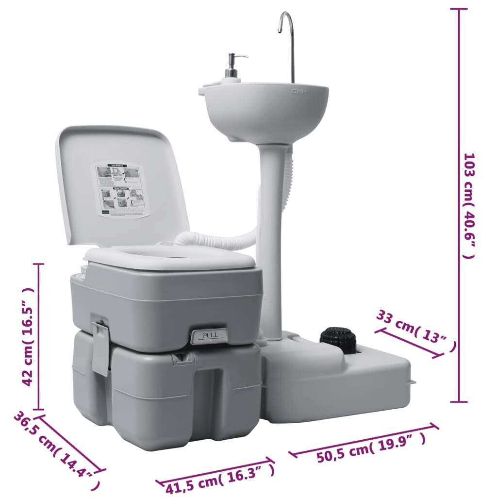 Šis lengvo ir kompaktiško dizaino nešiojamo stovyklavimo tualeto ir pastatomo praustuvo rinkinys puikiai tiks stovyklavimui, išvykoms su nameliais ant ratų, statybvietėms, maisto renginiams, pastatomiems kioskeliams ir kt. Praktiškas tualetas: tualete yra 20 litrų talpos bakas atliekoms, tad jis suaugusiųjų galės būti naudojamas 4–5 dienas. Siekiant užtikrinti lengvesnį atliekų ištuštinimą, mobilus tualetas pasižymi T tipo 3 krypčių nuleidimo sistema.Daugiafunkcis pastatomas praustuvas: siekiant užtikrinti, kad jis patenkins įvairius jūsų poreikius, ant pastatomo praustuvo pritvirtintas muilo dozatorius, rankšluosčių kabykla ir šviežio vandens bakas. Jį galėsite naudoti be rankų, – norint, jog vanduo imtų tekėti, jums reikės tik koja paspausti pompą.Vandens rezervuaras su ratukais: vandens rezervuare telpa pakankamai vandens skubiems atvejams. Kelios vandens išleidimo angos leidžia vandeniui greitai įtekėti bei ištekėti. Viršuje esanti rankena ir ratukai leidžia jį lengvai transportuoti.Patvari medžiaga: stovyklavimo rinkinys yra pagamintas iš tvirto, didelio tankio polietileno, tad jis atsparus smūgiams ir patvarus. Pastaba:Siekiant užtikrinti lengvą surinkimą, kiekvienas gaminys pristatomas su surinkimo instrukcijomis dėžėje.