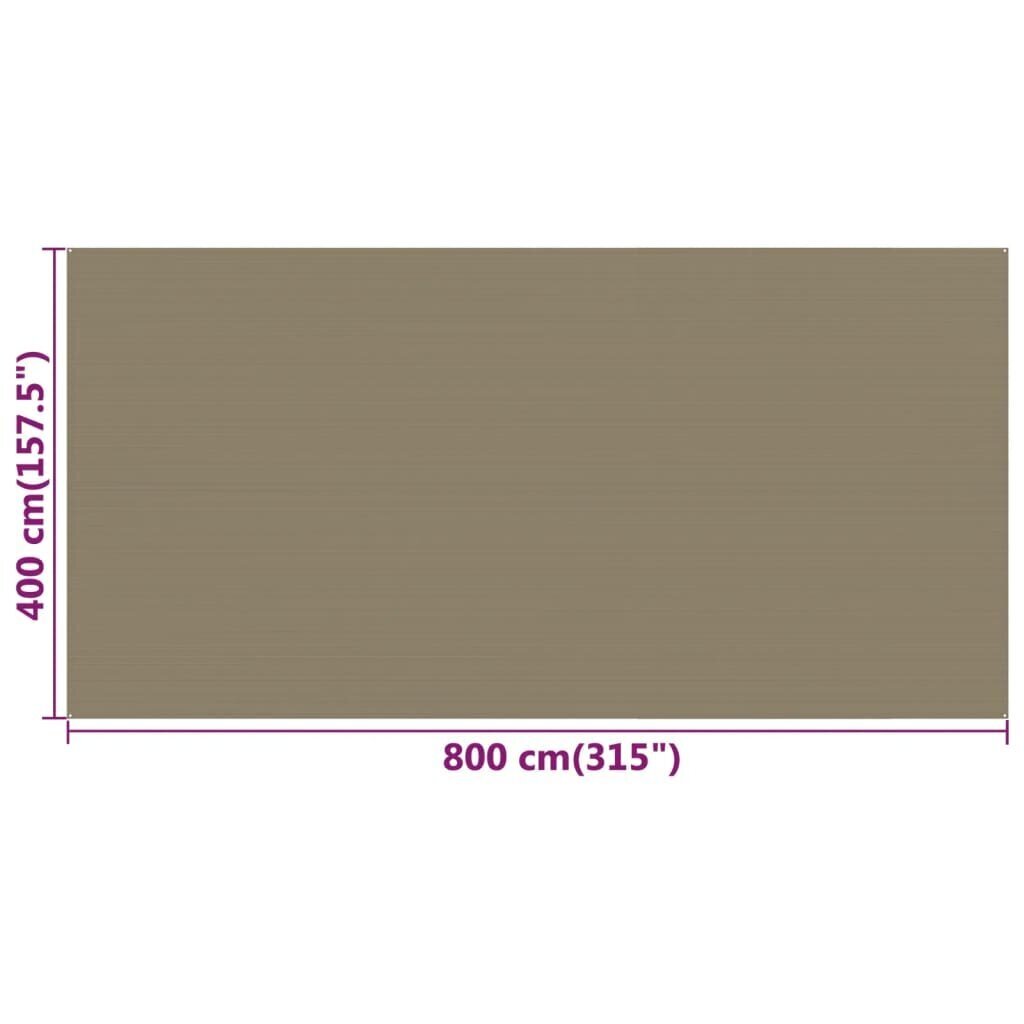 Palapinės kilimėlis yra pagamintas iš didelio tankio polietileno (HDPE), kuris yra labai patvarus, atsparus įbrėžimams, UV spinduliams ir oro sąlygoms, taigi užtikrina ilgalaikį naudojimą ir išvaizdos išlaikymą.