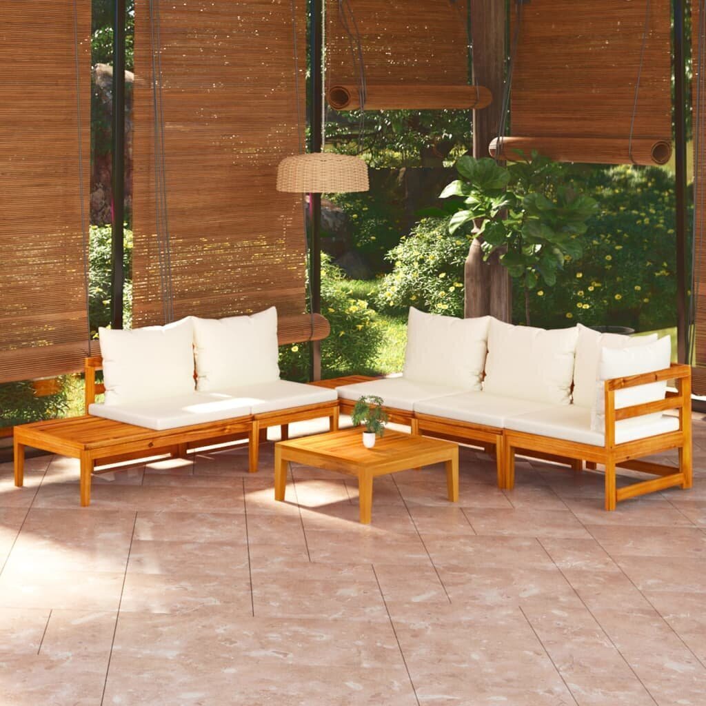 Šis medinis sodo poilsio baldų komplektas bus puikiu pasirinkimu poilsiui, mėgavimuisi oru, norint nusnausti arba pokalbiams su savo šeima ar draugais. Pasižymintis nesenstančiu dizainu, poilsio baldų komplektas jūsų kiemui, terasai ar sodui suteiks kaimiško žavesio. Pagamintas iš akacijos medienos masyvo, lauko baldų komplektas yra atsparus įvairioms oro sąlygoms ir itin patvarus. Kartu su storai paminkštintomis pagalvėlėmis, šis kiemo poilsio baldų komplektas suteiks didžiausio komforto. Prie suoliuko derantį staliuką, atsižvelgiant į savo poreikius, galėsite sumontuoti tiek kairėje, tiek dešinėje pusėje. Norėdami susikurti savo asmeninį sodo poilsio baldų komplektą, sofos komplektą galite derinti su kitomis modulinėmis dalimis! Pastaba: Norėdami, jog jūsų lauko baldai tarnautų ilgą laiką, rekomenduojame juos reguliariai valyti ir nepalikti lauke be reikiamos apsaugos. Valymas: Naudokite švelnų muilo tirpalą. Laikymas: Jei įmanoma, laikykite vėsioje, sausoje patalpoje. Jei gaminį laikysite lauke, apsaugokite jį vandeniui atspariu uždangalu. Po lietaus ar sningant, nuo plokščių paviršių nuvalykite vandens ar sniego perteklių ir juos išdžiovinkite. Norėdami išvengti drėgmės sukeliamos žalos, užtikrinkite pakankamą oro cirkuliaciją.