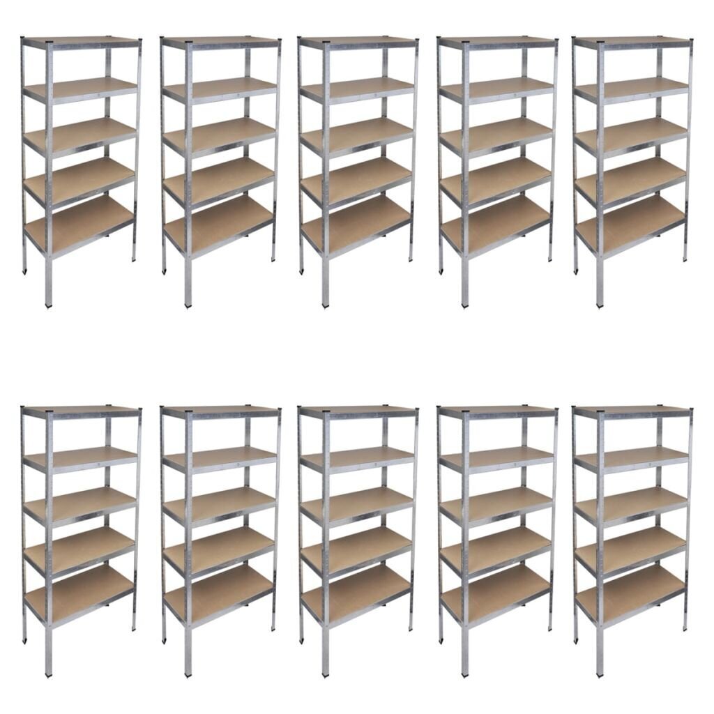 Šis 10 stelažų komplektas yra puikus sprendimas tvarkingai saugoti įvairius daiktus namuose ar dirbtuvėse. Pagal jūsų poreikį, stelažai gali būti montuojami horizontaliai arba vertikaliai. Stelažo lentynos pagamintos iš kokybiško MDF ir sutvirtintos tvirtus plieniniu rėmu. Didžiausia leistina vienos lentynos apkrova – 175 kg (tolygiai paskirsčius svorį), didžiausia leistina apkrova stelažui – 875 kg. Cinku dengtas paviršius yra nerūdijantis ir tarnaus ilgai.