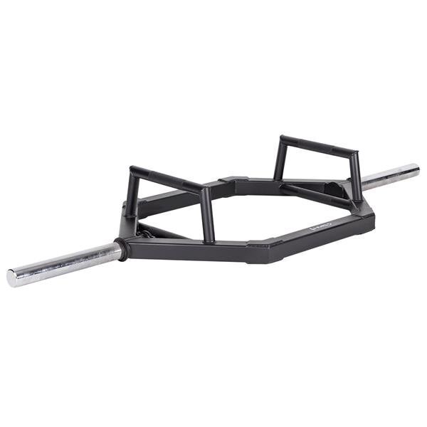 • HMS GHX02B Hex Bar Use and Design: The HMS GHX02B hex bar is designed for weight training, featuring a handle arrangement suitable for lifting and exercises like shoulder shrugs, and can be used with standard or Olympic weights.