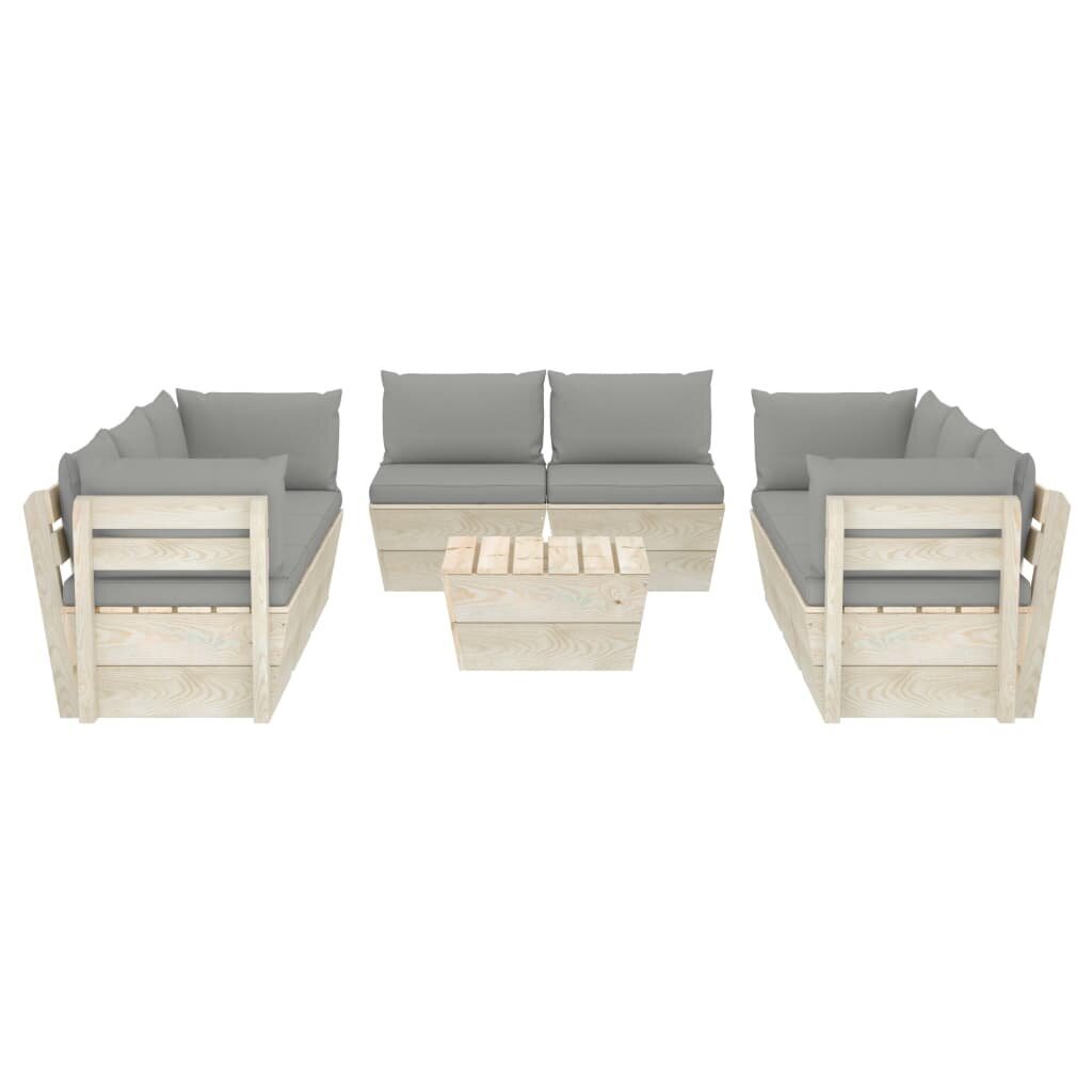 - Sodo poilsio baldų komplektas iš palečių: Šis 9 dalių komplektas iš impregnuotos eglės medienos pasižymi patvarumu, moderniu dizainu ir moduliška konstrukcija, leidžiančia jį išdėlioti pagal poreikį.