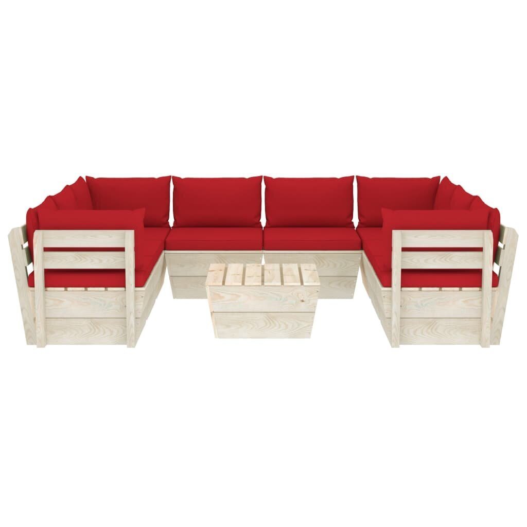- 9 dalių sodo poilsio baldų komplektas iš palečių: Šis komplektas iš palečių yra tinkamas poilsiui, žavingai kaimiškam interjerui ir pagamintas iš impregnuotos eglės medienos, užtikrinančios patvarumą ir minimalų priežiūros poreikį.