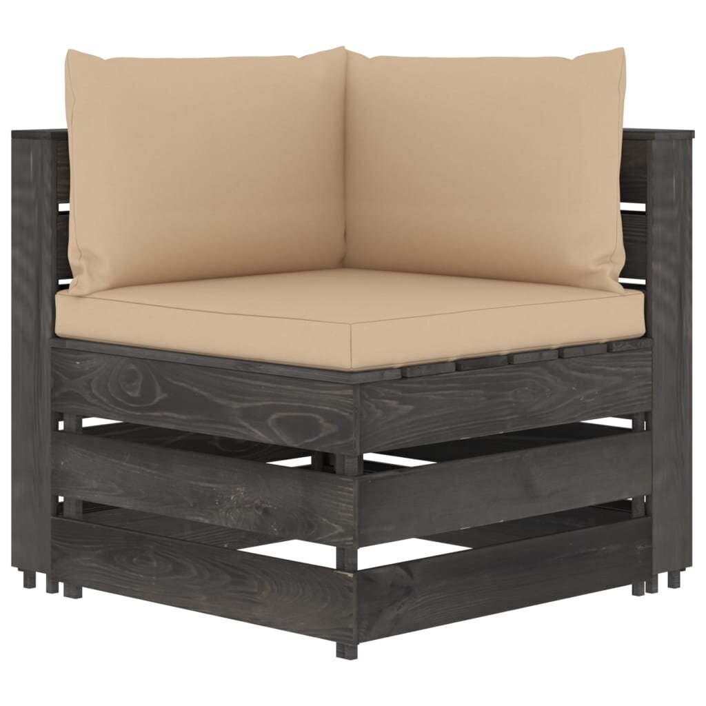 Lauko sodo poilsio baldų komplektas pasižymi tvirtumu, patvarumu ir lengva priežiūra, nes jis pagamintas iš impregnuotos pušies medienos ir su storai paminkštintomis pagalvėlėmis.
