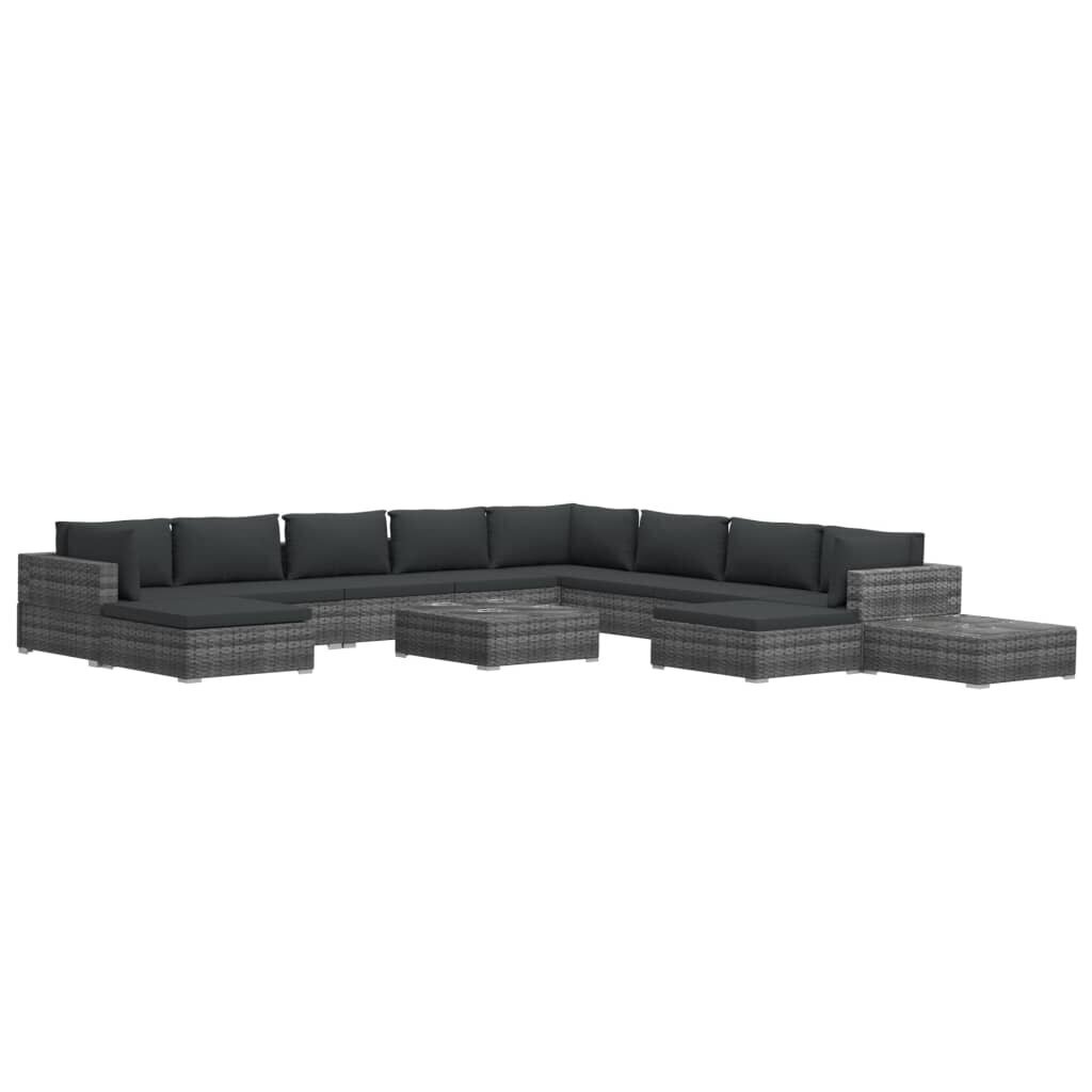 Šis ratano lauko baldų komplektas yra funkcionalus ir stilingas, jame yra 3 kampinės sofos, 5 vidurinės sofos, 2 pakojos, 2 kavos staliukai, 10 sėdynės ir 11 nugaros pagalvėlių, skirtas naudoti sode, terasoje ar pavėsinėje.