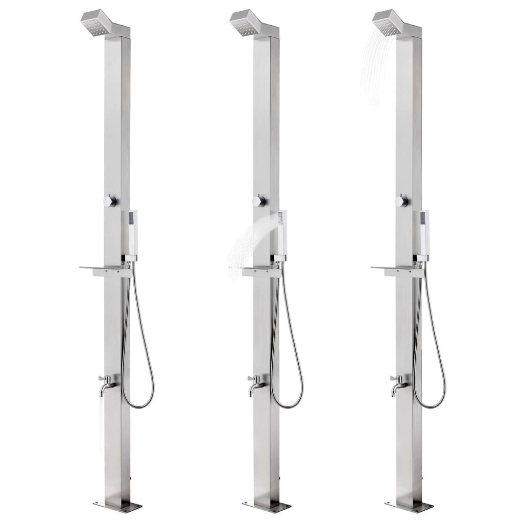 Šis sodo dušas pasižymi moderniu dizainu bei taps puikia jūsų baseino ir kitų lauko erdvių detale. Šis lauko dušas yra pagamintas iš nerūdijančio plieno, kuris užtikrina, kad jis yra atsparus įvairioms oro sąlygoms. Siekiant užtikrinti, kad dušo sistema patenkins jūsų sodininkystės, laistymo ir greito išsiprausimo poreikius, ji turi dušo galvutę, rankinį dušą ir maišytuvą kojoms plauti. Dviguba fiksuojama žarna yra lanksti ir skirta rankiniam dušui. Ji taip pat turi plastikinį rankinio dušo laikiklį ir paprastą vandens žarnos pakabinimą užtikrinančią lentyną. Patvarus ir korozijai atsparus dušo pagrindas yra pagamintas ir aukščiausios kokybės WPC bei pasižymi patvarumą bei ilgaamžiškumą užtikrinančiu šlifuotu nerūdijančio plieno rėmu. Jis taip pat užtikrina aukščiausią higienos lygį, tad puikiai tinka jūsų lauko erdvei. Pasižymintis tvirtumu ir universalumu, dušo padėklas puikiai tiks naudoti ir kaip pagrindas baseino kopetėlėms. Panirkite į išties atpalaiduojantį maudymąsi duše ir mėgaukitės moderniu šios lauko dušo sistemos stiliumi!