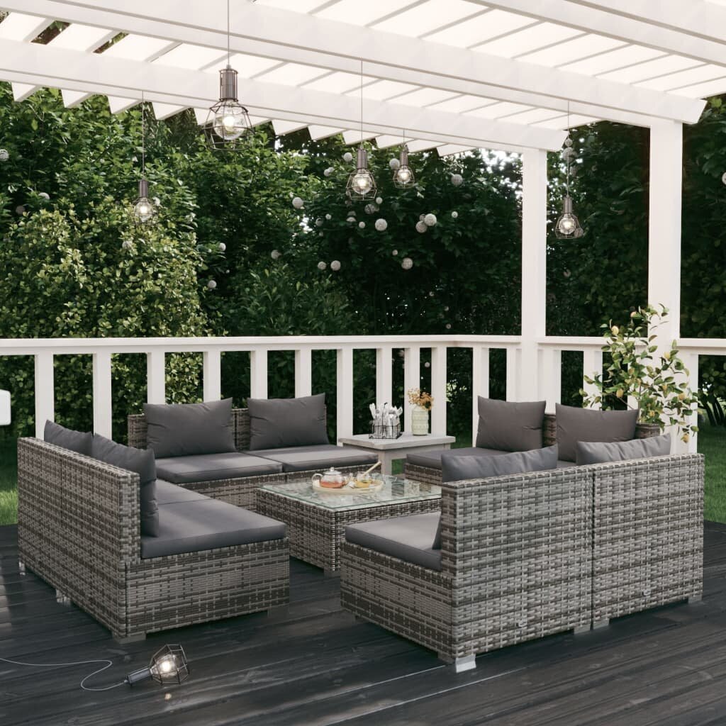 Visi šie modernių baldų bruožai leidžia teigti, jog šio stiliaus gaminiai yra paprasti ir tuo pačiu labai universalūs, todėl juos lengva pritaikyti bet kokio dydžio kambariuose. Sodo komplektas su pagalvėlėmis, 9 dalių, pilkas, poliratanas patiks tiems, kurie nori sukurti minimalistinę, neperkrautą erdvę, išlaikant tvarkos ir gaivos įspūdį.