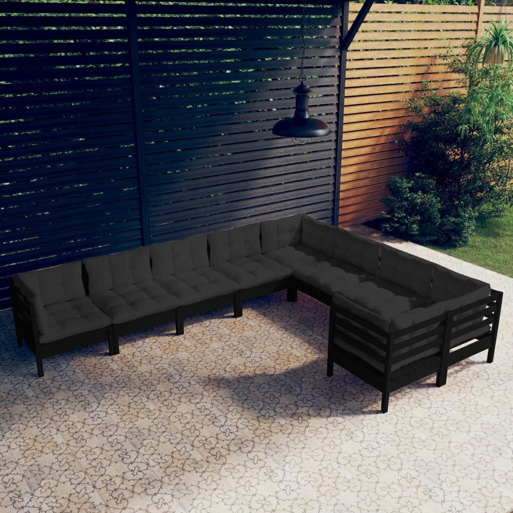 Visi šie modernių baldų bruožai leidžia teigti, jog šio stiliaus gaminiai yra paprasti ir tuo pačiu labai universalūs, todėl juos lengva pritaikyti bet kokio dydžio kambariuose. Sodo komplektas su pagalvėmis, 9 dalių, juodas, pušies masyvas patiks tiems, kurie nori sukurti minimalistinę, neperkrautą erdvę, išlaikant tvarkos ir gaivos įspūdį.