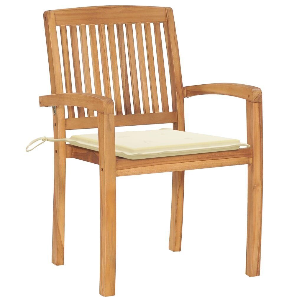 Su šiuo pagalvėles turinčių viena ant kitos sudedamų sodo kėdžių komplektu suteikite savo valgomajam, sodui ar kiemui kaimiško žavesio! Pasižymintis elegantišku lentjuosčių dizainu, šis valgomojo kėdžių komplektas suteiks jūsų vidaus ar lauko erdvei naujo įvaizdžio. Šis tikmedžio medienos baldų komplektas yra pagamintas iš itin patvaraus tikmedžio kietmedžio ir buvo grūdintas, džiovintas krosnyje ir tuomet šlifuotas smulkiais grūdeliais dengtu švitriniu popieriumi, taip suteikiant jam nepaprastai lygią išvaizdą. Tikmedžio mediena yra žinoma dėl savo išskirtinio tvirtumo ir atsparumo įvairioms oro sąlygoms, todėl lyginant su bet kurio kito tipo mediena, yra dar tinkamesnė sodo baldams. Tikmedžio mediena yra puikus pasirinkimas norint įsigyti ilgaamžį sodo baldą. Jį lengva prižiūrėti ir valyti drėgna šluoste. Be to, nenaudojant bei siekiant sutaupyti vietos, valgomojo kėdės gali būti sudėtos viena ant kitos. Negana to, pridėtos pagalvėlės suteikia papildomo komforto. Kiekviena pagalvėlė turi 2 virvučių rinkinius, kurių pagalba galite jas pritvirtinti prie kėdės. Pastaba: norėdami, jog jūsų lauko baldai tarnautų ilgą laiką, rekomenduojame juos reguliariai valyti ir nepalikti lauke be apsaugos.Valymas: naudokite švelnaus muilo tirpaląLaikymas: jei įmanoma, laikykite vėsioje, sausoje patalpoje. Jei prekė laikoma lauke, apsaugokite ją vandeniui nepralaidžia danga. Po lietaus ar sningant, nuvalykite vandens ir sniego perteklių nuo plokščių paviršių. Palikite pakankamai oro cirkuliacijos, taip išvengsite su drėgme susijusios žalos.