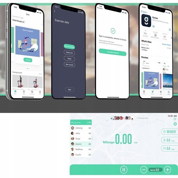 Bluetooth garsiakalbis ir treniruočių programa – įmontuota Bluetooth garsiakalbė ir telefono laikiklis leidžia žiūrėti filmus, serialus, klausytis muzikos ir kalbėtis su draugais. Prieiga prie Gymax treniruočių programos leidžia kurti kūno rengybos planus ir kontroliuoti treniruočių eigą