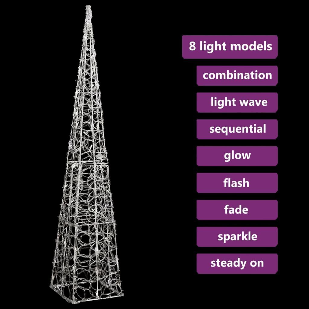 Su šiuo LED lemputėmis apšviestu kūgiu per Kalėdas galite viduje ir lauke sukurti jaukią bei šventišką atmosferą. Šio dekoratyvaus šviečiančio kūgio korpusas yra pagamintas iš akrilo, kuris suteikia jam prabangios, į ledą panašios blizgios išvaizdos ir apšviečia aplink jį esančią zoną. Pasižymintis energiją tausojančiomis LED lemputėmis, jis užtikrina ryškų bei galingą apšvietimą. Jis turi 8 skirtingus švietimo režimus: kombinuotą, banguojantį, nuoseklų, lėtai mirksintį, mirksintį, lėtai išblunkantį, mirgantį ir nepertraukiamai šviečiantį. Ši graži kalėdinė dekoracija šviečiantis kūgis ir pridėtas baterijų skyrius yra atsparūs vandeniui, tad gaminys yra tinkamas tiek naudojimui viduje, tiek lauke.