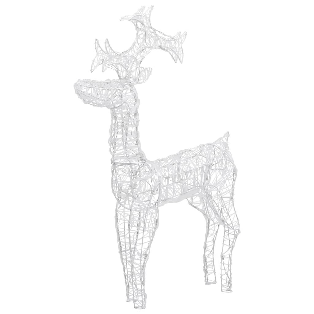 Papuoškite savo sodą, namus ar butą mūsų unikalia Kalėdų dekoracijų kolekcija. Ši šalta balta spalva apšviesta dekoracija-pastatomas elnias atskleis tikrąjį Kalėdų švenčių grožį! Ši dekoracija-elnias yra pagaminta iš akrilo, kuris užtikrina, kad ji visą švenčių laikotarpį bus atspari įvairioms oro sąlygoms. Ji iš anksto apšviesta 90 energiją tausojančių, ilgaamžių ir patvarių LED lempučių. Pastaba: Pridėta USB jungtis nėra atspari vandeniui, tad ši dalis turi būti apsaugota nuo vandens. Tačiau, kadangi laidas ir gaminys yra atsparūs vandeniui, Kalėdų dekoracija gali būti naudojama lauke.