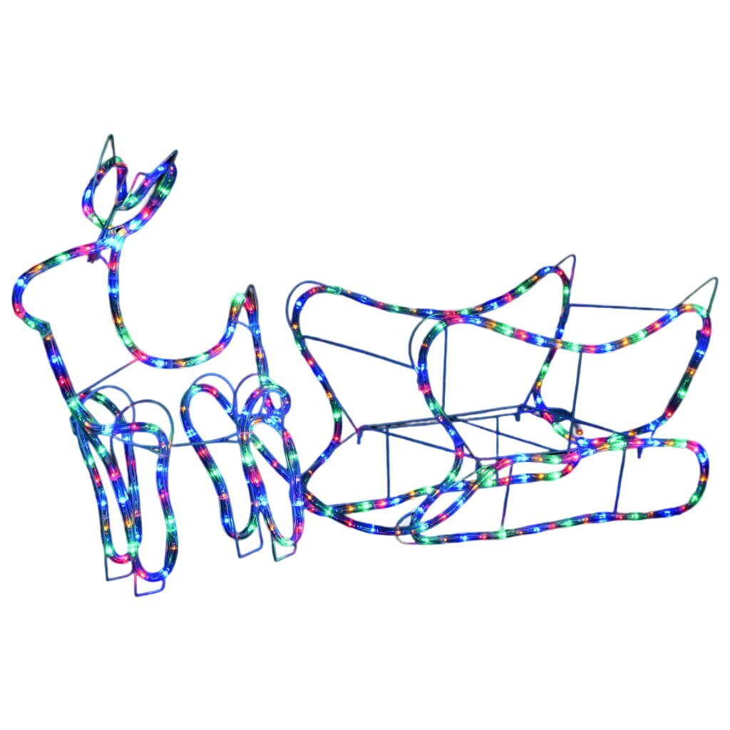 Su šia šviečiančia kalėdine dekoracija šias Kalėdas suteikite savo namams kibirkšties. Pasižyminti IP44 klase, ši dekoracija yra atspari vandeniui. Elniai ir rogės yra apšviesti įvairių spalvų LED lemputėmis, taip suteikiant jiems švelnaus spindesio bei užtikrinant, kad jie taps puikia išskirtine vidaus ir lauko erdvių detale. LED juosta turi 36 itin ryškias lemputes metre (viso 252 LED lemputės) bei yra tausojanti energiją. Atkreipkite dėmesį: kištukas pridėtas į pristatymą. Norint užtikrinti saugumą, naudokite tik kartu su šviesiu laidu ir liekamosios srovės įtaisu (nepridėta).