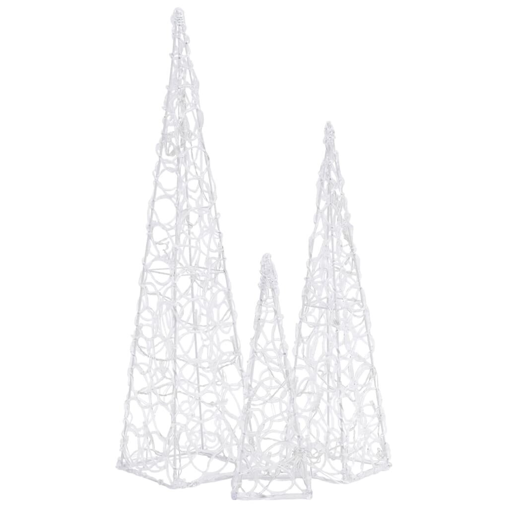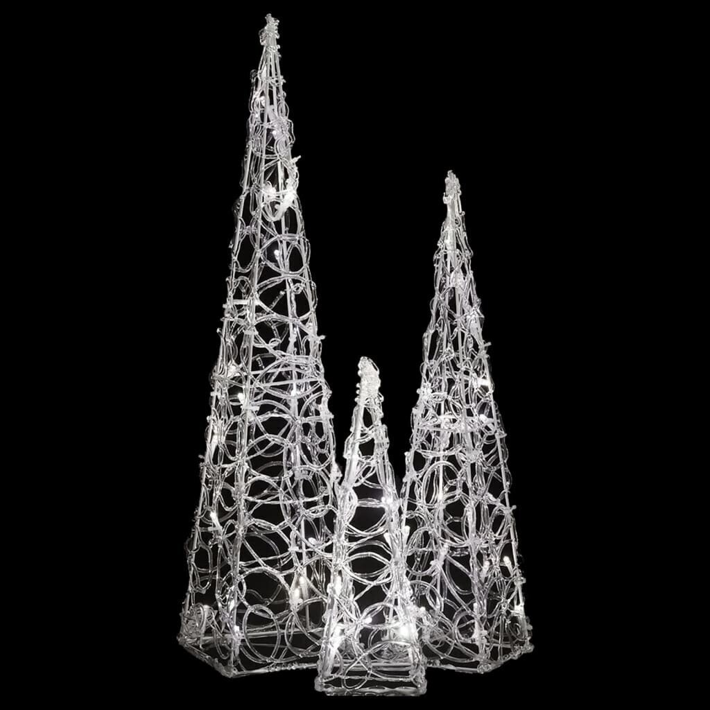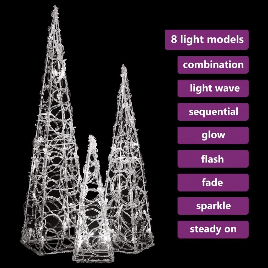 Su šiuo LED lemputėmis apšviestu kūgių rinkiniu per Kalėdas galite viduje ir lauke sukurti jaukią bei šventišką atmosferą. Rinkinį sudaro 3 skirtingų aukščių šviečiantys kūgiai. Dekoratyvaus šviečiančio kūgio korpusas yra pagamintas iš akrilo, kuris suteikia jam prabangios, į ledą panašios blizgios išvaizdos ir apšviečia aplink jį esančią zoną. Pasižymintis energiją tausojančiomis LED lemputėmis, jis užtikrina ryškų bei galingą apšvietimą. Jis turi 8 skirtingus švietimo režimus: kombinuotą, banguojantį, nuoseklų, lėtai mirksintį, mirksintį, lėtai išblunkantį, mirgantį ir nepertraukiamai šviečiantį. Ši graži kalėdinė dekoracija šviečiančių kūgių rinkinys ir pridėtas baterijų skyrius yra atsparūs vandeniui, tad gaminys yra tinkamas tiek naudojimui viduje, tiek lauke.