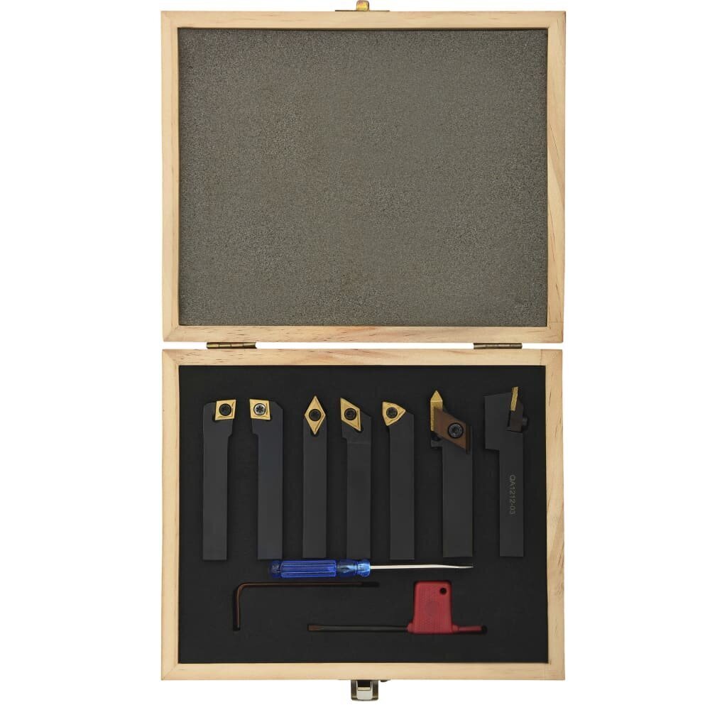 12 mm tekinimo įrankių rinkinį sudaro įvairūs įrankiai tekinimui, pjovimui ir sriegimui, pagaminti iš karbido ir anglies plieno, su keičiamosiomis dalimis ir dėklu.