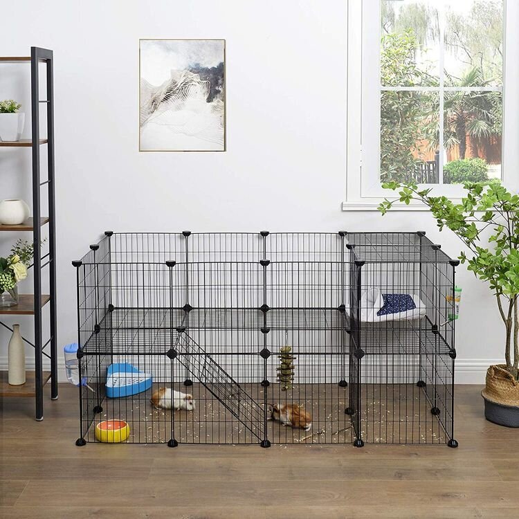 - Lankstus maniežas mažiems gyvūnams: Šis maniežas galima lengvai surinkti iš 36 tinklelio plokščių, leidžiantį sukurti didelį, mažo aukščio aptvarą arba prijungti du lygius, užtikrinant lankstumą ir saugumą.