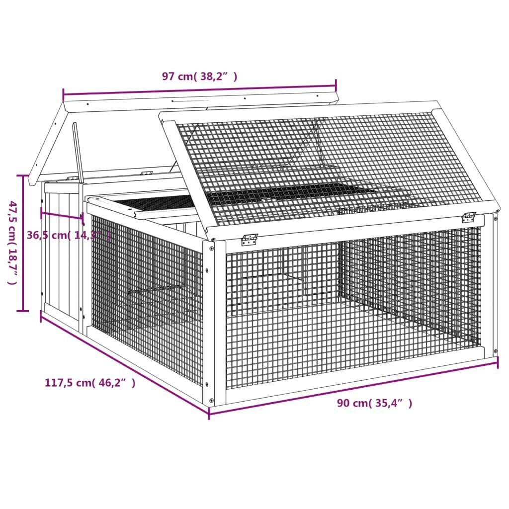 Šis triušių narvas pasižymi tvirta konstrukcija iš pušies medienos, vielinio tinklelio sienomis ir kelių aukštų veiklos centru, kuris suteikia pakankamai vietos ir saugumo mažiems augintiniams.