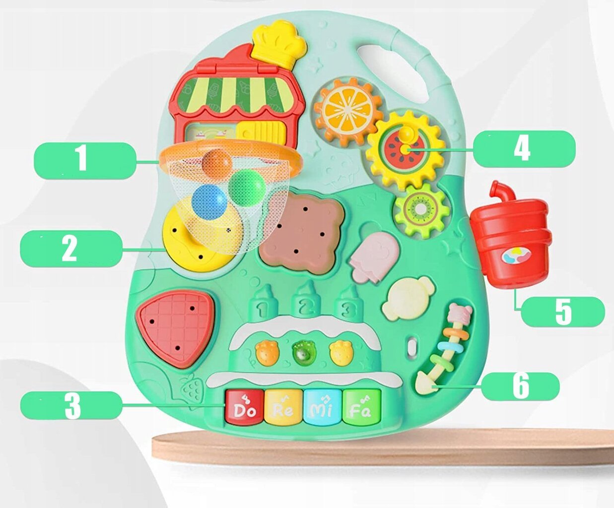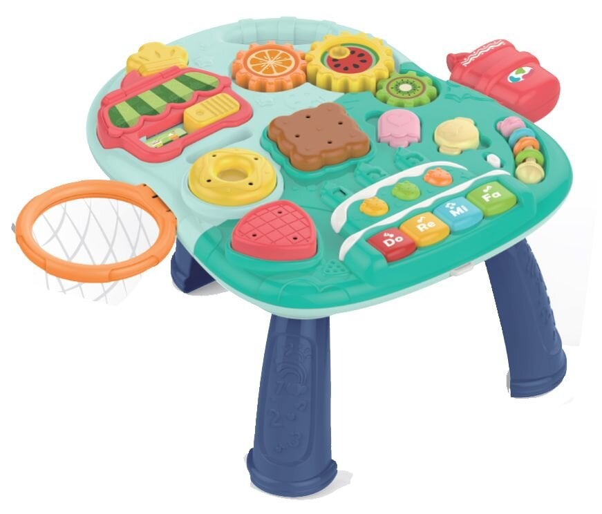 - Naudojami priedai formuoja vaiko raidą. Jis turi galimybę mesti kamuoliukus į mini krepšelį ir derinti atitinkamas formas.