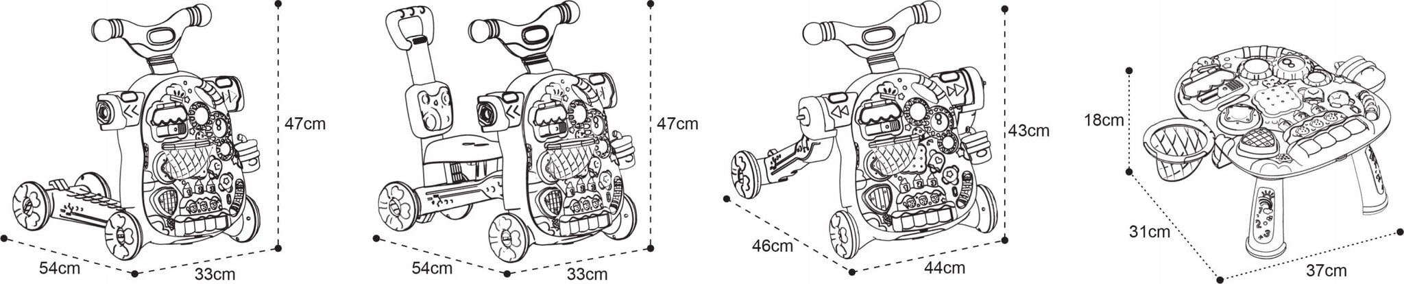 - Daugiafunkcinis – stūmimo vaikštynė ir aktyvus stalas, pianinas, paspirtukas ir pasivažinėjimas