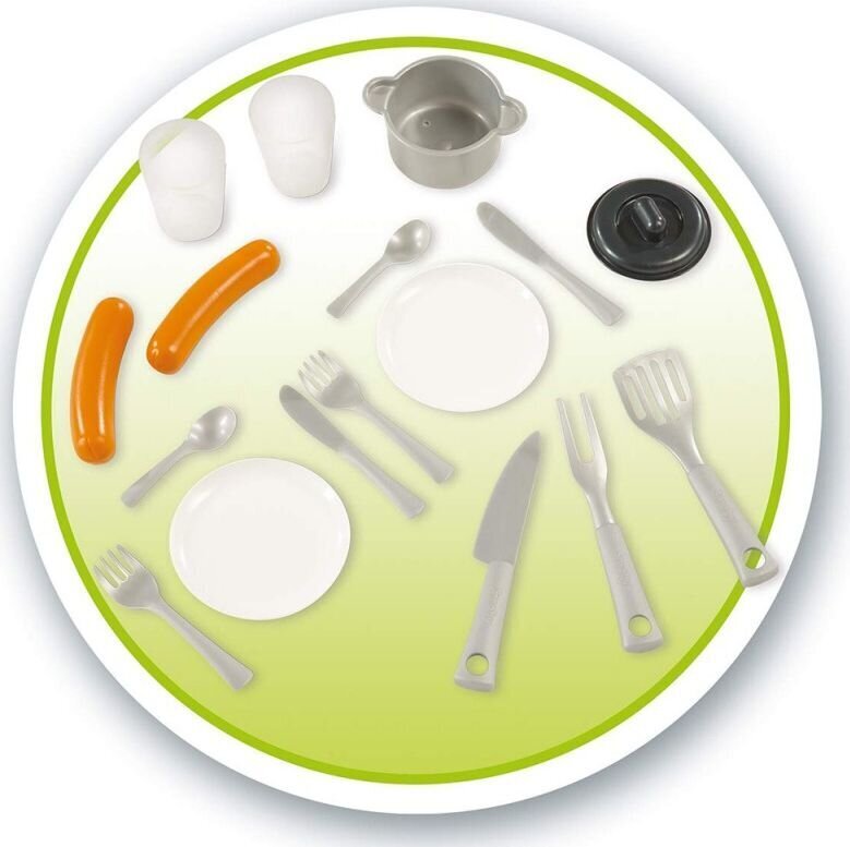 - Pridedami virtuvės aksesuarai: 2 lėkštės, 2 stiklinės, stalo įrankiai, puodas ir dvi žaislinės dešrelės;