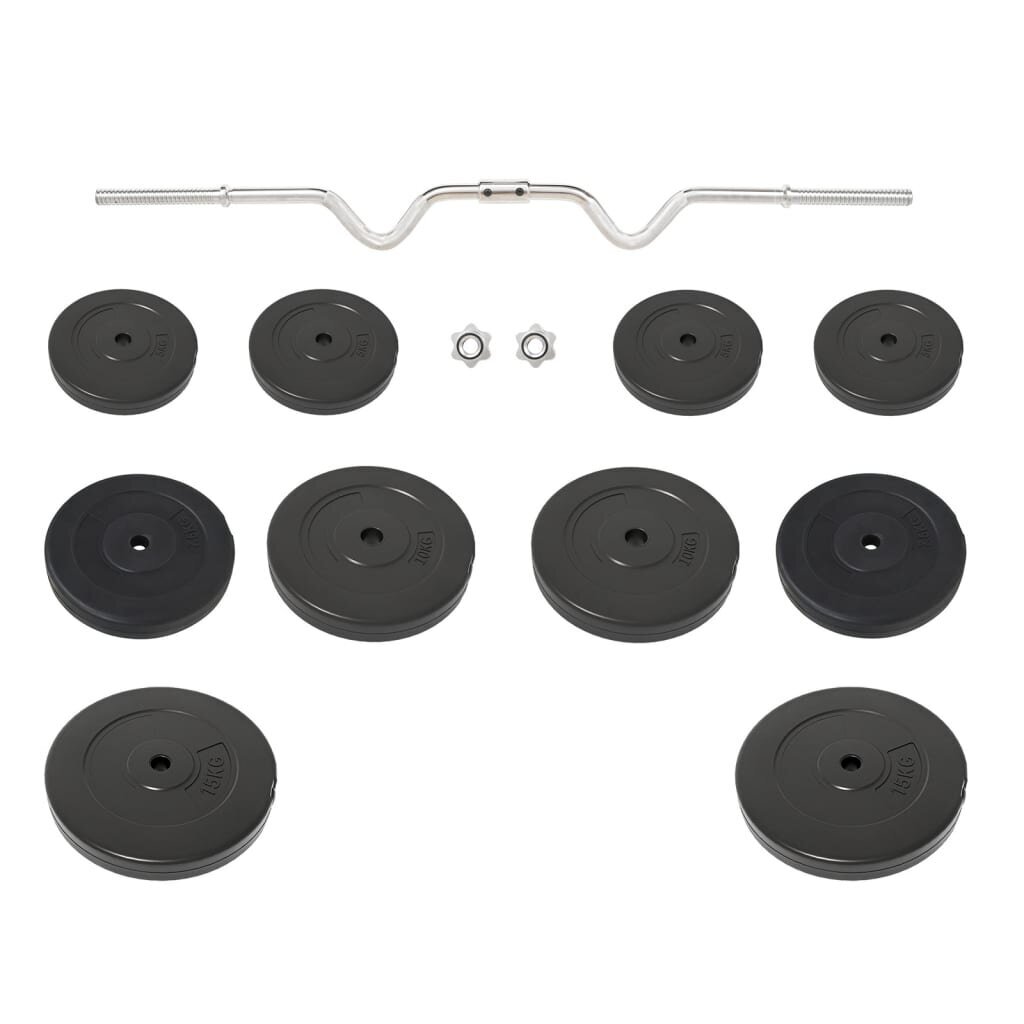 Šis universalus štangos su svoriais rinkinys puikiai tiks tiems, kurie ieško įvairių mankštinimosi būdų. Patvari medžiaga: pagaminta iš chromuoto plieno, štanga yra išties tvirta ir stabili. Be to, štangos svoris yra pagamintas iš cemento ir dengtas tvirtu, grindų nebraižančių plastiku, tad išvengsite įkyraus svorių sukeliamo garso.Skirtingų svorių rinkinys: 4 skirtingų svorių, – 4 x 5 kg, 2 x 7,5 kg, 2 x 10 kg, 2 x 15 kg, pagalba galėsite nesunkiai pasirinkti tinkamą derinį. Skirtingų svorių rinkiniai visuomet patenkins įvairius jūsų treniruočių poreikius.Aiškiai pažymėti svoriai: siekiant užtikrinti, kad galėsite greitai ir paprastai juos atskirti, kiekvieno svorio diskas yra aiškiai pažymėtas.Daugiafunkcis svarmuo: daugiafunkcis štangos rinkinys tinka krūtinei, bicepsams, rankoms, tricepsams ir nugaros raumenims treniruoti.Praktiškas žvaigždės formos užraktas: žvaigždės formos užraktai užtikrina, kad svoriai tvirtai laikysis. Pastaba:Siekiant užtikrinti lengvą surinkimą, kiekvienas gaminys pristatomas su surinkimo instrukcijomis dėžėje.