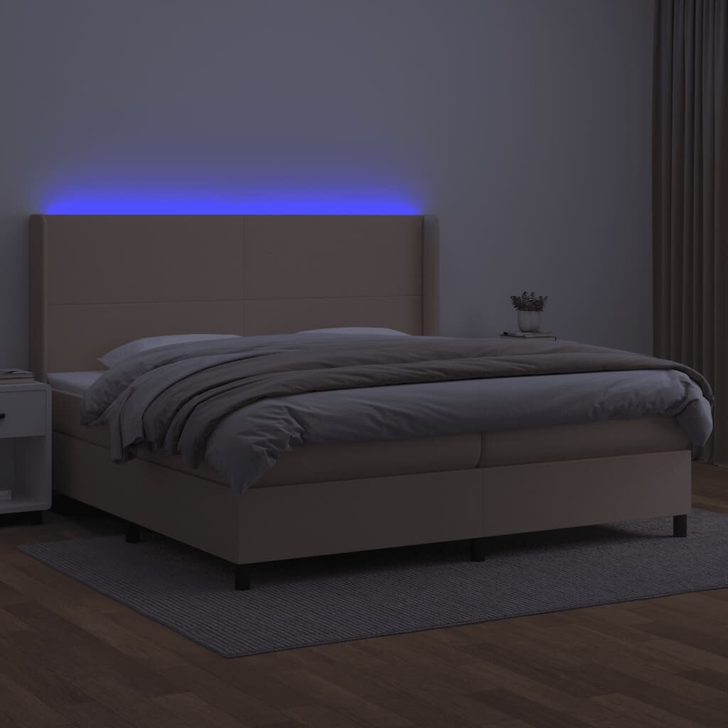 Visi šie modernių baldų bruožai leidžia teigti, jog šio stiliaus gaminiai yra paprasti ir tuo pačiu labai universalūs, todėl juos lengva pritaikyti bet kokio dydžio kambariuose. vidaXL Lova su spyruoklėmis/čiužiniu/LED, kapučino, 200x200cm dirbtinė patiks tiems, kurie nori sukurti minimalistinę, neperkrautą erdvę, išlaikant tvarkos ir gaivos įspūdį.
