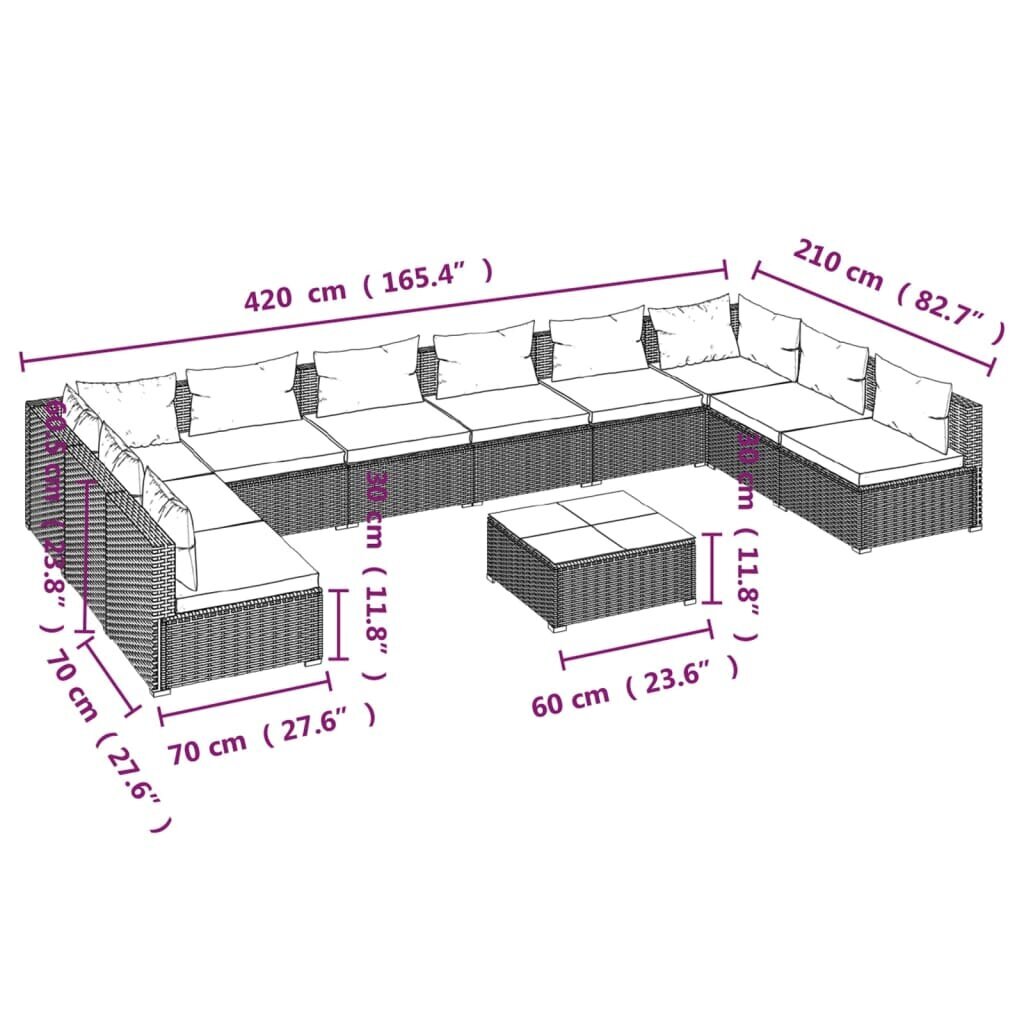 Visi šie modernių baldų bruožai leidžia teigti, jog šio stiliaus gaminiai yra paprasti ir tuo pačiu labai universalūs, todėl juos lengva pritaikyti bet kokio dydžio kambariuose. vidaXL Sodo komplektas su pagalvėlėmis, 11 dalių, juodas, poliratanas patiks tiems, kurie nori sukurti minimalistinę, neperkrautą erdvę, išlaikant tvarkos ir gaivos įspūdį.