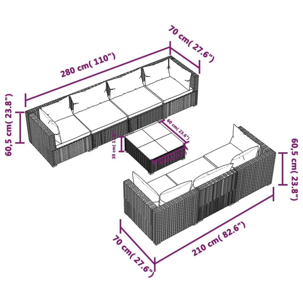 Visi šie modernių baldų bruožai leidžia teigti, jog šio stiliaus gaminiai yra paprasti ir tuo pačiu labai universalūs, todėl juos lengva pritaikyti bet kokio dydžio kambariuose. vidaXL Sodo komplektas su pagalvėlėmis, 8 dalių, juodas, poliratanas patiks tiems, kurie nori sukurti minimalistinę, neperkrautą erdvę, išlaikant tvarkos ir gaivos įspūdį.