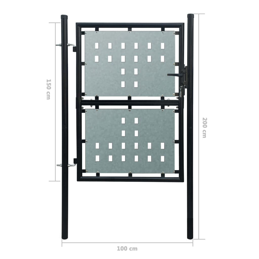 Šiuolaikiški aukštos kokybės vartai yra puikus būdas įrengti įėjimą į jūsų sodą ar kiemą. Ypatingai stabilūs ir patvarūs vartai bus praktiška teritorijos, sodo, kiemo ar terasos pertvara. Galvanizuotas lakštas su dekoratyviniu skylučių raštu sustiprina rėmą, todėl vartai bus ne tik patikima apsauga, bet ir gražus dekoratyvinis įėjimo į teritoriją elementas. Iš aukštos kokybės plieno pagaminti vartai yra dengti milteliniu būdu – apsaugai nuo rūdžių ir korozijos. Šie vartai yra su 2 tvirtais stulpais ir patvariais vyriais – patogiam montavimui. Pakuotėje yra patikima rakinimo sistema su 3 rakteliais. Šie vartai yra puikus stiliaus, patvarumo, stabilumo ir atsparumo rūdims derinys!