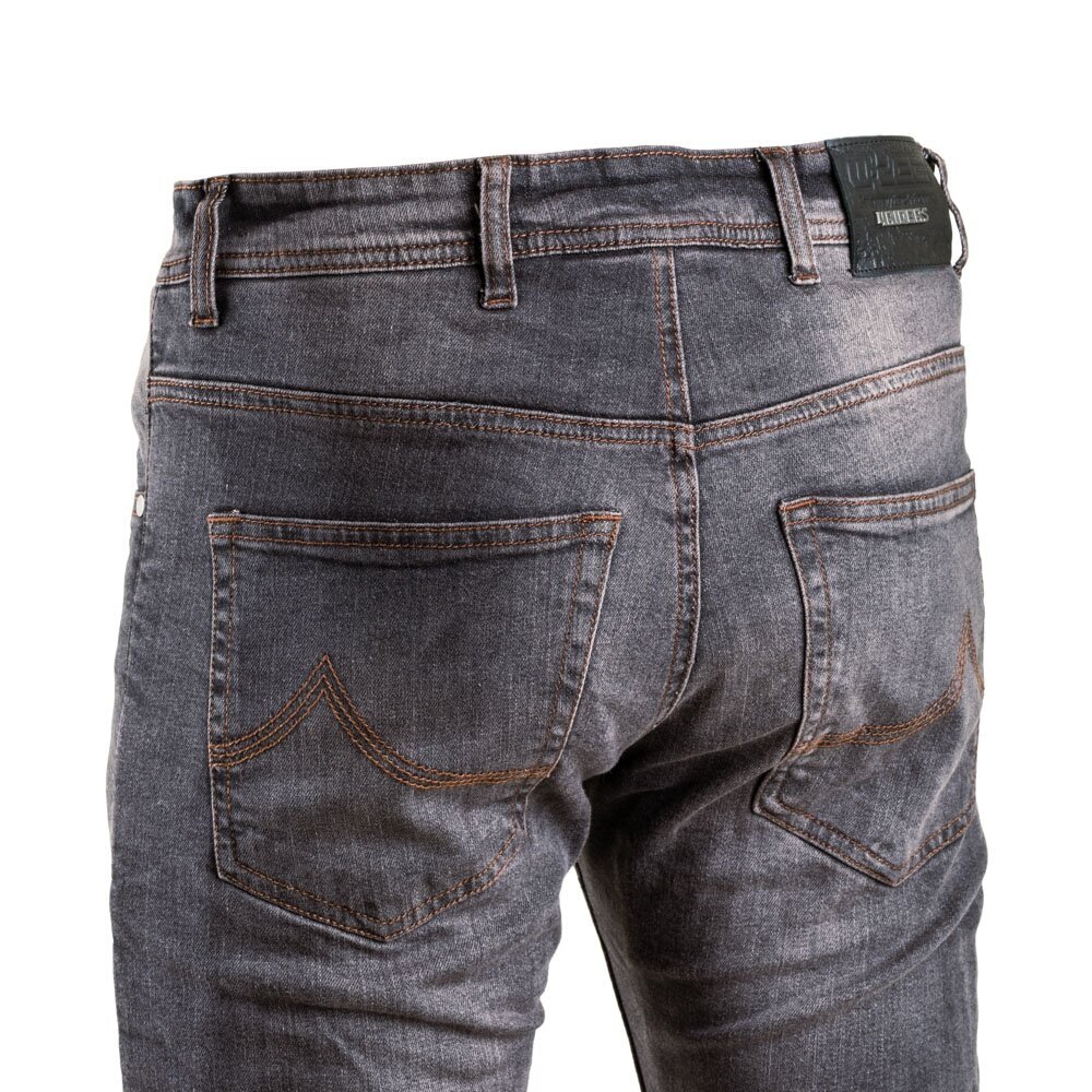 The Men’s Motorcycle Jeans W-TEC Kancelor resemble regular jeans because they have a stylish, minimalist design with features like contrast stitching, buttons, snap buttons, and a metal zipper, making them indistinguishable from standard jeans when the protective inserts are removed.